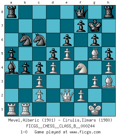 Last move : 1-0 2016 November 2 12:50:47 [Event "FICGS__CHESS__CLASS_B__000244"] [Site "FICGS"] [Date "2016.06.26"] [Round "1"] [White "Mevel,Alberic"] [Black "Cirulis,Ilmars"] [Result "1-0"] [WhiteElo "1901"] [BlackElo "1980"] 1.e4 a6 2.d4 e6 3.Nf3 d5 4.Nc3 Bb4 5.e5 c5 6.a3 Bxc3+ 7.bxc3 c4 8.a4 Qa5 9.Qd2 Bd7 10.Be2 Bxa4 11.O-O h6 12.g3 Ne7 13.Nh4 Nbc6 14.Ba3 g6 15.Ng2 b5 16.Ne3 h5 17.Rfb1 Kf8 18.Bf1 Kg7 19.h4 Qd8 20.Bh3 Nb8 21.Nd1 Nc8 22.Qe2 Nb6 23.Ne3 Nc6 24.Ng2 a5 25.Bc1 b4 26.Bg5 Qf8 27.Nf4 1-0 St. George (Baker) defense Kingside Castling by player White (move 11) Player White won this chess game. Follow this game move after move (download)Chess opens and enriches your mind. (Saudin Robovic) Der Verteidiger gebe der Gewalt nach, aber nur der Gewalt. Er schaffe sich nicht freiwillig, etwa aus Blindheit oder aus Schrecken, irgendwelche Schwächen. Er lasse sich nicht bluffen. (Emanuel Lasker) El ganar no lo es todo... pero el perder es nada. (Mednis) Le plus grand jeu de l'esprit jamais inventé, plus vous l'apprenez, plus vous y prenez du plaisir. (Garry Kasparov) Those who make the worst use of their time are the first to complain of its brevity. (Jean de la Bruyere)
