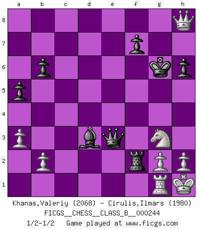 Last move : 1/2-1/2 2016 June 29 15:34:2 [Event "FICGS__CHESS__CLASS_B__000244"] [Site "FICGS"] [Date "2016.06.26"] [Round "1"] [White "Khanas,Valeriy"] [Black "Cirulis,Ilmars"] [Result "1/2-1/2"] [WhiteElo "2068"] [BlackElo "1980"] 1.d4 a6 2.e4 e6 3.Bd3 d5 4.Nc3 Bb4 5.Nge2 dxe4 6.Bxe4 Nf6 7.Bf3 O-O 8.O-O Nbd7 9.a3 Bd6 10.Ng3 c6 11.Nce4 Bc7 12.Re1 Nxe4 13.Nxe4 h6 14.Bd2 a5 15.Bc3 b6 16.Ng3 Bb7 17.Nh5 Qg5 18.d5 exd5 19.Bxg7 Rfe8 20.Bc3 Be5 21.Bxe5 Nxe5 22.Bxd5 cxd5 23.f4 Qf5 24.fxe5 Rxe5 25.Rxe5 Qxe5 26.Qf3 Ba6 27.Nf6+ Kg7 28.Qxd5 Qe3+ 29.Kh1 Rc8 30.Nh5+ Kg6 31.Ng3 Rc5 32.Qd8 Rxc2 33.Qg8+ Kf6 34.Rd1 Rd2 35.Rg1 Rf2 36.Qa8 Bd3 37.Qh8+ Kg6 1/2-1/2 Queen's pawn Kingside Castling by player Black (move 7) Kingside Castling by player White (move 8) This chess game ended in a draw. Follow this game move after move (download)Fischer Chess play was always razor-sharp, rational and brilliant. One of the best ever. (Dave Regis) Der Bart als Geschlechtszeichen mitten im Gesicht ist obszön. Daher gefällt er den Weibern. [Zugegeben, kein Schachzitat, aber unglaublich originell] (Arthur Schopenhauer) Nos gusta pensar. (Gary Kasparov) L'attaque fait le spectacle, la défense gagne les matchs. (Dicton footballistique) A generalist learns less and less about more and more until he knows nothing about everything. (Author unknown)
