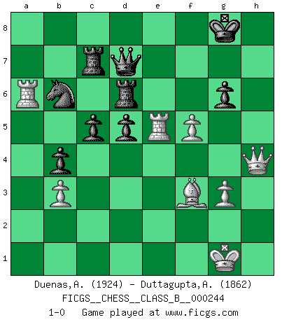 Last move : 1-0 2016 November 14 10:32:24 [Event "FICGS__CHESS__CLASS_B__000244"] [Site "FICGS"] [Date "2016.06.26"] [Round "1"] [White "Duenas,Alexis"] [Black "Duttagupta,Aniruddha"] [Result "1-0"] [WhiteElo "1924"] [BlackElo "1862"] 1.d4 Nf6 2.c4 e6 3.g3 c5 4.d5 exd5 5.cxd5 b5 6.Bg2 d6 7.e4 Nbd7 8.Nf3 g6 9.O-O Bg7 10.Re1 O-O 11.Bf4 Re8 12.Nbd2 Nb6 13.Qc2 Bb7 14.Bf1 a6 15.a4 Nxa4 16.Nc4 Bf8 17.Bd2 Nd7 18.Na5 Qc7 19.b3 Nab6 20.Bc3 Re7 21.h4 Rae8 22.h5 Bg7 23.Bxg7 Kxg7 24.Bg2 Ba8 25.Qd2 Kg8 26.Ng5 Nf6 27.hxg6 hxg6 28.Nc6 Bxc6 29.dxc6 Ra8 30.Qc3 Ng4 31.f4 f6 32.Nh3 Qxc6 33.Nf2 b4 34.Qc2 Nxf2 35.e5 Ne4 36.exf6 Rf7 37.Rxe4 d5 38.Re5 Rxf6 39.Ra5 Rc8 40.Rxa6 Qd7 41.Qe2 Kf8 42.Bf3 Rc7 43.Bg4 Qc6 44.Qh2 Kg8 45.Bf3 Qd7 46.Qh4 Rd6 47.f5 1-0 Catalan Opening Kingside Castling by player White (move 9) Kingside Castling by player Black (move 10) Player White won this chess game. Follow this game move after move (download)Mistrust is the most necessary characteristic of the Chess player. (Siegbert Tarrasch) Die Arbeit ist etwas Unnatürliches. Die Faulheit allein ist göttlich. (Anatole France) No hay precio que no valga la pena por la cabellera del Rey enemigo. (Koblentz) Les pièces de l'échiquier étaient impitoyables. Elles le retenaient, elles l'absorbaient. Il y avait de l'horreur en cela, mais aussi une harmonie unique. Car, qu'y a-t-il dans le monde, à part les échecs ? (V. Nabokov) Faith : not wanting to know what is true. (Friedrich Nietzsche)