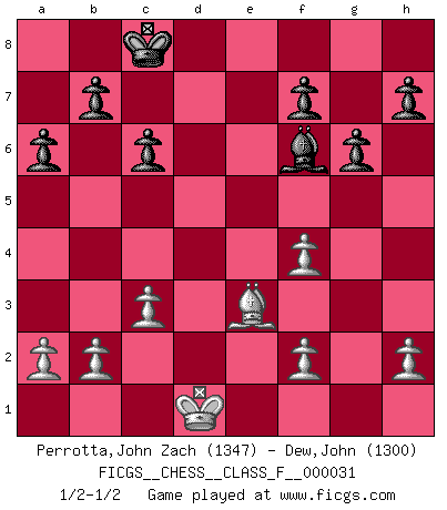 Last move : 1/2-1/2 2007 July 12 18:42:57 [Event "FICGS__CHESS__CLASS_F__000031"] [Site "FICGS"] [Date "2007.03.26"] [Round "1"] [White "Perrotta,John Zach"] [Black "Dew,John"] [Result "1/2-1/2"] [WhiteElo "1347"] [BlackElo "1300"] 1.e4 e5 2.Nc3 Bb4 3.Nd5 Nc6 4.Qg4 g6 5.Bc4 Nf6 6.Qf3 Be7 7.d3 Nd4 8.Qd1 Nxd5 9.Bxd5 c6 10.Bb3 Qa5+ 11.c3 d5 12.Nf3 Bg4 13.Be3 Bxf3 14.gxf3 Nxb3 15.Qxb3 O-O-O 16.exd5 Rxd5 17.O-O-O Rhd8 18.d4 Qb5 19.Qxb5 Rxb5 20.dxe5 Rxe5 21.Kb1 a6 22.Rxd8+ Bxd8 23.f4 Rd5 24.Kc2 Bf6 25.Rd1 Rxd1 26.Kxd1 1/2-1/2 Vienna game Queenside Castling by player Black (move 15) Queenside Castling by player White (move 17) This chess game ended in a draw. Follow this game move after move (download)All I want to do, ever, is just play Chess. (Bobby Fischer) Es ist wirklich schade, dass so viele Schachspieler nicht auf ihr Äußeres achten! (Alexandra Kosteniuk) El pensamiento metódico es mas útil en el Ajedrez que la inspiración. (C. J. S. Purdy) En blitz, le Cavalier l'emporte sur le Fou. (Vlastimil Hort) Question: Is 'This statement is paradoxical' a paradoxical statement ? Or is it a meta-paradox ? (Normajean Yates)