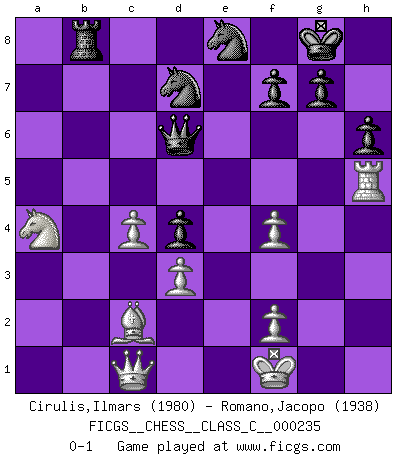 Last move : 0-1 2016 October 6 9:10:10 [Event "FICGS__CHESS__CLASS_C__000235"] [Site "FICGS"] [Date "2016.06.26"] [Round "1"] [White "Cirulis,Ilmars"] [Black "Romano,Jacopo"] [Result "0-1"] [WhiteElo "1980"] [BlackElo "1938"] 1.b4 e5 2.a3 d5 3.Bb2 Bd6 4.e3 Nf6 5.c4 c6 6.Nc3 d4 7.Na4 O-O 8.exd4 exd4 9.Bxd4 Bxh2 10.Nf3 Bc7 11.Qc2 h6 12.Qb2 Nbd7 13.Be2 Re8 14.Kf1 b6 15.d3 a5 16.Rh4 axb4 17.axb4 Qe7 18.Bd1 c5 19.Bc3 Rb8 20.Bc2 Bb7 21.Re1 Qd6 22.Rxe8+ Nxe8 23.bxc5 bxc5 24.Qc1 Bxf3 25.gxf3 Bd8 26.Rh5 Bf6 27.f4 Bd4 28.Bxd4 cxd4 0-1 Polish (Sokolsky) opening Kingside Castling by player Black (move 7) Player Black won this chess game. Follow this game move after move (download)Fischer wanted to give the Russians a taste of their own medicine. (Larry Evans) Schach ist ein Reich, wo sich die menschliche Phantasie frei entfalten kann. (David Bronstein) Ciertamente el estado mental actual de Bobby Fischer es una tragedia. Uno de los mas grandes jugadores de Ajedrez del mundo -el orgullo y pena del Ajedrez Americano. (Frank Brady) La tactique, c'est ce que vous faites quand il y a quelque chose à faire; la stratégie, c'est ce que vous faites quand il n'y a rien à faire. (Savielli Tartacower) Your best chance to get a Royal Flush in a casino is in the bathroom. (Anonymous)