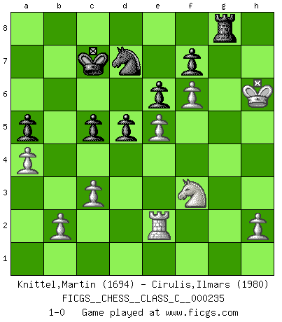 Last move : 1-0 2016 July 24 19:50:25 [Event "FICGS__CHESS__CLASS_C__000235"] [Site "FICGS"] [Date "2016.06.26"] [Round "1"] [White "Knittel,Martin"] [Black "Cirulis,Ilmars"] [Result "1-0"] [WhiteElo "1694"] [BlackElo "1980"] 1.Nf3 a6 2.e4 e6 3.d4 d5 4.Nc3 Nf6 5.Bg5 Be7 6.e5 Nfd7 7.Bxe7 Qxe7 8.Bd3 c5 9.dxc5 Qxc5 10.O-O Qc7 11.Qe2 Nc6 12.Rfe1 h6 13.Nb1 Qb6 14.c3 Nc5 15.Qe3 O-O 16.Nbd2 Nd7 17.Qxb6 Nxb6 18.a4 a5 19.Nd4 Bd7 20.Nb5 Nb8 21.Nb3 Bxb5 22.Bxb5 Rc8 23.f4 Kf8 24.g4 Ke7 25.Re2 Nc6 26.Kf2 Na7 27.Bd3 Nc6 28.Kg3 Rd8 29.Nd4 Rdc8 30.Bb5 g6 31.f5 gxf5 32.gxf5 Rg8+ 33.Kh4 Rac8 34.f6+ Kd8 35.Nf3 Nd7 36.Kh5 Kc7 37.Bxc6 bxc6 38.Rg1 Rxg1 39.Nxg1 c5 40.Kxh6 Rg8 41.Nf3 1-0 Reti Opening Kingside Castling by player White (move 10) Kingside Castling by player Black (move 15) Player White won this chess game. Follow this game move after move (download)A good player is always lucky. (Jose Raul Capablanca) Deine Wertungszahl - vorausgesetzt einige Jahre schachliche Anstrengung - entspricht etwa dem zehnfachen Deines IQ plus 1000. (Jonathan Levitt) Todo lo que importa ante el tablero de Ajedrez son buenas jugadas. (Bobby Fischer) Pour moi, les échecs ne sont pas un jeu mais un art. (Alexandre Alekhine) The only thing that matters is the evidence. (Horatio Caine, C.S.I. Miami)