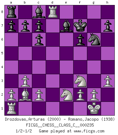 Last move : 1/2-1/2 2016 July 23 14:44:40 [Event "FICGS__CHESS__CLASS_C__000235"] [Site "FICGS"] [Date "2016.06.26"] [Round "1"] [White "Drozdovas,Arturas"] [Black "Romano,Jacopo"] [Result "1/2-1/2"] [WhiteElo "2000"] [BlackElo "1938"] 1.e4 e5 2.Nf3 Nc6 3.Bb5 Nf6 4.O-O Nxe4 5.d4 Nd6 6.Bxc6 dxc6 7.dxe5 Nf5 8.Qxd8+ Kxd8 9.Rd1+ Ke8 10.Nc3 Ne7 11.h3 Ng6 12.b3 Be7 13.Ne2 f6 14.exf6 gxf6 15.Bb2 Kf7 16.Rd3 Rd8 17.Rxd8 1/2-1/2 Ruy Lopez : Berlin defense, Open variation Kingside Castling by player White (move 4) This chess game ended in a draw. Follow this game move after move (download)Chess is the art which expresses the science of logic. (Mikhail Botvinnik) Ich spiele ehrlich und spiele, um zu gewinnen. Wenn ich verliere nehme ich meine Medizin. (Robert James Fischer) Bobby es la celebridad menos entendida y malinterpretada que camina el la faz de esta tierra. (Yasser Seirawan) J'ai vu le vaincu d'Echecs jouer des années durant dans l'espoir de la fête de la victoire. Car tu es plus riche de ce qu'elle existe si même elle n'est point pour toi. Ainsi de la perle du fond des mers. (Antoine de Saint-Exupéry) There are two major products that came out of Berkeley: LSD and UNIX. We do not believe this is to be a coincidence. (Jeremy S. Anderson)