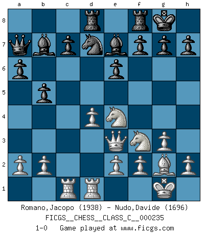 Last move : 1-0 2016 October 26 2:4:7 [Event "FICGS__CHESS__CLASS_C__000235"] [Site "FICGS"] [Date "2016.06.26"] [Round "1"] [White "Romano,Jacopo"] [Black "Nudo,Davide"] [Result "1-0"] [WhiteElo "1938"] [BlackElo "1696"] 1.d4 Nf6 2.c4 e6 3.g3 d5 4.Nf3 Be7 5.Bg2 O-O 6.O-O dxc4 7.Qc2 a6 8.Qxc4 b5 9.Qc2 Bb7 10.Bd2 Be4 11.Qc1 Bb7 12.Bf4 Nd5 13.Nc3 Nxf4 14.Qxf4 Nd7 15.Rfd1 Qb8 16.Qe3 Qa7 17.Rac1 Rad8 18.Ne4 1-0 This chess game has been lost on time (started : 2016.06.26 23:15:53) Catalan Opening Kingside Castling by player Black (move 5) Kingside Castling by player White (move 6) Player White won this chess game. Follow this game move after move (download)The older I grow, the more I value Pawns. (Keres) Alle offensichtlichen Züge sehen nach dem Spiel in der Analyse verdächtig aus. (Viktor Kortschnoi) Un mal plan es mejor que no tener ningún plan. (Frank Marshall) Le joueur d'Echecs qui veut atteindre le top est obligé de développer son propre credo créatif. Alexeï Stepanovicth Souétine. Il est facile d'écrire des livres ! Ce qui est difficile, c'est de jouer ! (Alexeï Stepanovicth Souétine) It's not the size of the dog in the fight, it's the size of the fight in the dog. (Mark Twain)