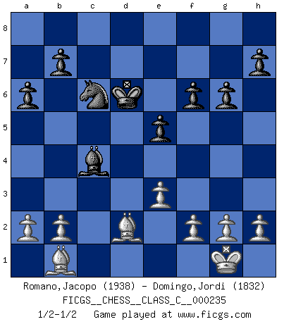 Last move : 1/2-1/2 2016 August 9 16:39:1 [Event "FICGS__CHESS__CLASS_C__000235"] [Site "FICGS"] [Date "2016.06.26"] [Round "1"] [White "Romano,Jacopo"] [Black "Domingo,Jordi"] [Result "1/2-1/2"] [WhiteElo "1938"] [BlackElo "1832"] 1.d4 d5 2.c4 dxc4 3.e3 Nf6 4.Bxc4 e6 5.Nf3 c5 6.O-O a6 7.Bb3 Nc6 8.Nc3 Be7 9.dxc5 Qxd1 10.Rxd1 Bxc5 11.Bd2 Bd7 12.Rac1 Ba7 13.Be1 Ke7 14.Na4 Rhd8 15.Nc5 Bxc5 16.Rxc5 Be8 17.R5c1 Rxd1 18.Rxd1 Rd8 19.Bc3 Rxd1+ 20.Bxd1 g6 21.Kf1 Ne4 22.Be1 e5 23.Bc2 Nd6 24.Ng5 f6 25.Ne4 Nxe4 26.Bxe4 Bf7 27.Bb1 Bc4+ 28.Kg1 Kd6 29.Bd2 1/2-1/2 Queen's gambit accepted Kingside Castling by player White (move 6) This chess game ended in a draw. Follow this game move after move (download)Not only will I predict his triumph over Botvinnik, but I'll go further and say that he'll probably be the greatest Chess player that ever lived. (John Collins) Wer der Ansicht ist, daß alle Schachspieler verrückt sind, wird durch Studium des Lebens von Emil Josef Diemer nicht auf andere Gedanken kommen. (Hans Ree) El Ajedrez es un invernadero donde los frutos del carácter pueden madurar mas completamente que en la vida. (Edward Morgan Foster) Même si vous avez un bon coup à faire, regardez toujours s'il n'y en a pas un qui lui soit préférable. (Pedro Damiano) Warrior pose battles inner weakness and wins focus. You see that there is no war within you. You're on your own side, and you are your own strength. (Terri Guillemets)