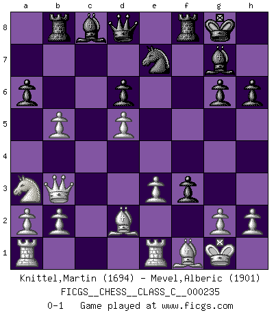 Last move : 0-1 2016 December 29 9:35:56 [Event "FICGS__CHESS__CLASS_C__000235"] [Site "FICGS"] [Date "2016.06.26"] [Round "1"] [White "Knittel,Martin"] [Black "Mevel,Alberic"] [Result "0-1"] [WhiteElo "1694"] [BlackElo "1901"] 1.e4 c5 2.Nf3 Nc6 3.d4 cxd4 4.Nxd4 e5 5.Nb5 d6 6.N1c3 a6 7.Na3 b5 8.Nd5 Nge7 9.Bd3 Nxd5 10.exd5 Ne7 11.c4 g6 12.O-O Bg7 13.cxb5 O-O 14.Re1 f5 15.Qb3 Rb8 16.Bg5 h6 17.Be3 e4 18.Bf1 f4 19.Bd2 e3 20.fxe3 f3 0-1 Sicilian : Labourdonnais-Loewenthal (Kalashnikov) variation Kingside Castling by player White (move 12) Kingside Castling by player Black (move 13) Player Black won this chess game. Follow this game move after move (download)A chess genius has died; a loss for humanity. (Viktor Kortchnoi, about Bobby Fischer's death) Meine Liebe ist Schach, Schach, Schach. Ich muss jeden Tag Schach spielen, deshalb fühle ich mich so stark. (Miguel Najdorf) Debemos de asegurarnos de que el Ajedrez no se convierta en un lenguaje muerto, muy interesante, pero solo para un grupo muy pequeño. (Sytze Faber) La guerre est enfant de la passion, la passion est enfant du narcissisme et le narcissisme est l'enfant. (...) Une autre partie ? (Thibault de Vassal) Luck never gives; it only lends. (Swedish proverb)