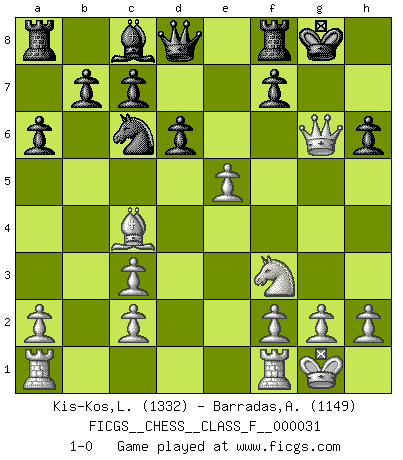 Last move : 1-0 2007 April 4 15:51:14 [Event "FICGS__CHESS__CLASS_F__000031"] [Site "FICGS"] [Date "2007.03.26"] [Round "1"] [White "Kis-Kos,Laszlo"] [Black "Barradas,Anderson"] [Result "1-0"] [WhiteElo "1332"] [BlackElo "1149"] 1.e4 e5 2.Nf3 Nc6 3.Bc4 h6 4.Nc3 Nf6 5.d4 Bb4 6.dxe5 Nxe4 7.Qd5 O-O 8.Qxe4 a6 9.O-O Bxc3 10.bxc3 d6 11.Bxh6 gxh6 12.Qg6+ 1-0 King's pawn game Kingside Castling by player Black (move 7) Kingside Castling by player White (move 9) Player White won this chess game. Follow this game move after move (download)In Chess, as it is played by masters, chance is practically eliminated. (Emanuel Lasker) Mein Gehirn das ist mein zweitwichtigstes Organ [Aus dem Film: Der Schläfer]. (Woody Allen) Preferería tener un Peón que un dedo. (Reuben Fine) Comme les marins qui ont mille raisons différentes d'aller en mer, les joueurs d'échecs en ont tout autant avant de s'installer devant une table et jouer... (Vincent Bertignac, philosophe) Art is not a thing, it is a way. (Elbert Hubbard)