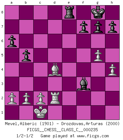 Last move : 1/2-1/2 2017 January 8 1:21:14 [Event "FICGS__CHESS__CLASS_C__000235"] [Site "FICGS"] [Date "2016.06.26"] [Round "1"] [White "Mevel,Alberic"] [Black "Drozdovas,Arturas"] [Result "1/2-1/2"] [WhiteElo "1901"] [BlackElo "2000"] 1.e4 c5 2.Nf3 d6 3.d4 cxd4 4.Nxd4 Nc6 5.Nc3 Nf6 6.Bc4 Qb6 7.Nb3 e6 8.Bf4 Ne5 9.Be2 Be7 10.Be3 Qc7 11.f4 Nc4 12.Nb5 Qc6 13.Bxc4 Qxc4 14.Qd3 Qc6 15.N3d4 Qd7 16.O-O-O a6 17.Nxd6+ Qxd6 18.e5 Qc7 19.exf6 Bxf6 20.g4 O-O 21.g5 Be7 22.h4 b5 23.f5 e5 24.f6 exd4 25.fxe7 Qxe7 26.Bxd4 Bg4 27.Rhe1 Qb7 28.Rd2 Rfe8 29.Qg3 Qf3 30.Rxe8+ Rxe8 31.Qxf3 Bxf3 1/2-1/2 Sicilian Queenside Castling by player White (move 16) Kingside Castling by player Black (move 20) This chess game ended in a draw. Follow this game move after move (download)Chess is a fairy tale of 1001 blunders. (Savielly Tartakower) Wenn ich gewinne bin ich ein Genie. Wenn nicht, dann bin ich keines. (Robert James Fischer) Hoy en día, si tu no eres un Gran Maestro a los 14 años, es mejor que lo olvides. (Anand Viswanathan) Ne tendez aucun piège pour le plaisir ! Ne jouez rien dans l'espoir que l'adversaire réagisse de façon stupide ! Prenez toujours pour acquis que l'adversaire va trouver le meilleur coup ! Ne jouez jamais de coup dans l'espoir que l'adversaire ne voie pas la menace ! Chacun de vos coups doit améliorer la position d'une façon ou d'une autre. The beginning is the most important part of the work. (Plato)