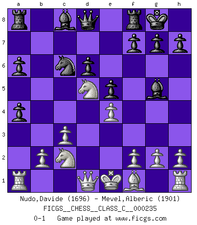 Last move : 0-1 2016 November 18 5:1:53 [Event "FICGS__CHESS__CLASS_C__000235"] [Site "FICGS"] [Date "2016.06.26"] [Round "1"] [White "Nudo,Davide"] [Black "Mevel,Alberic"] [Result "0-1"] [WhiteElo "1696"] [BlackElo "1901"] 1.e4 c5 2.Nf3 Nc6 3.d4 cxd4 4.Nxd4 Nf6 5.Nc3 e5 6.Ndb5 d6 7.Bg5 a6 8.Na3 b5 9.Nd5 Be7 10.Bxf6 Bxf6 11.c3 O-O 12.Nc2 Bg5 13.a4 bxa4 0-1 This chess game has been lost on time (started : 2016.06.26 23:15:53) Sicilian : Pelikan (Lasker/Sveshnikov) variation Kingside Castling by player Black (move 11) Player Black won this chess game. Follow this game move after move (download)It was clear to me that the vulnerable point of the American Grandmaster (Bobby Fischer) was in double-edged, hanging, irrational positions, where he often failed to find a win even in a won position. (Efim Geller) Wenn Dein Gegner dir ein Remis anbietet, versuch herauszufinden, weshalb er glaubt schlechter zu stehen. (Nigel Short) El sobresalir en el Ajedrez es un signo de una mente intrigante. (Sir Arthur Conan Doyle) Le temps de noter son nom sur la feuille de partie, j'étais déjà en zeitnot ! D'un modeste amateur apparié lors de la première ronde d'un open contre le grand-maître Azmaïparashvili. I know the human being and fish can coexist peacefully. (George W. Bush, Saginaw sept. 29, 2000)
