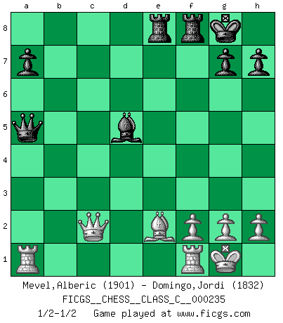 Last move : 1/2-1/2 2016 December 8 17:22:26 [Event "FICGS__CHESS__CLASS_C__000235"] [Site "FICGS"] [Date "2016.06.26"] [Round "1"] [White "Mevel,Alberic"] [Black "Domingo,Jordi"] [Result "1/2-1/2"] [WhiteElo "1901"] [BlackElo "1832"] 1.e4 e5 2.Nf3 Nc6 3.Bb5 Bb4 4.O-O Nge7 5.c3 Ba5 6.Na3 O-O 7.Nc4 d5 8.Nxa5 Nxa5 9.Nxe5 dxe4 10.d4 f6 11.b4 c6 12.Be2 fxe5 13.dxe5 Nd5 14.Bd2 Qe7 15.bxa5 Qxe5 16.Qb3 Be6 17.Qxb7 Nxc3 18.Bxc3 Qxc3 19.Rac1 Qxa5 20.Qxc6 Bxa2 21.Qxe4 Rae8 22.Qc2 Bd5 23.Ra1 1/2-1/2 Ruy Lopez (Spanish Opening) Kingside Castling by player White (move 4) Kingside Castling by player Black (move 6) This chess game ended in a draw. Follow this game move after move (download)The Chess pieces are the block alphabet which shapes thoughts; and these thoughts, although making a visual design on the chessboard, express their beauty abstractly, like a poem. (Marcel Duchamp) Ich organisiere ein großes Turnier, was mich etwa 120000 Dollar kostet. Ich denke, das ist das erste Mal in der Schachgeschichte, daß ein Schachgroßmeister auch als Mäzen auftritt. (Miguel Najdorf) El tablero es el mundo, las piezas es el fenomeno del universo, las reglas del juego son lo que llamamos leyes de la naturaleza y el jugador del lado opuesto, se encuentra oculto a nuestra vista. (Thomas Huxley) J'ai toujours senti une vague pitié pour l'homme qui ne connaît rien aux échecs, tout comme j'en aurais pour un homme ignorant de l'amour. Les Echecs, comme la musique ou comme l'amour, ont le pouvoir de rendre heureux. (Siegbert Tarrasch) Life is like a play: it's not the length but the excellence of the acting that matters. (Seneca)
