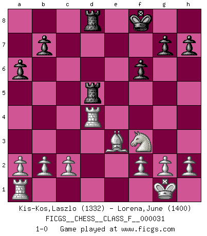 Last move : 1-0 2007 April 20 4:13:14 [Event "FICGS__CHESS__CLASS_F__000031"] [Site "FICGS"] [Date "2007.03.26"] [Round "1"] [White "Kis-Kos,Laszlo"] [Black "Lorena,June"] [Result "1-0"] [WhiteElo "1332"] [BlackElo "1400"] 1.e4 c5 2.Nf3 d6 3.d4 cxd4 4.Nxd4 e5 5.Bb5+ Nd7 6.Nf5 Ngf6 7.Nxd6+ Bxd6 8.Qxd6 Nxe4 9.Qxe5+ Qe7 10.Qxe7+ Kxe7 11.O-O Re8 12.Re1 Kf8 13.Nd2 a6 14.Bxd7 Bxd7 15.Rxe4 Red8 16.Nf3 Bg4 17.Bg5 Rd5 18.Rxg4 f6 19.Be3 Rad8 20.Rd4 1-0 Sicilian Kingside Castling by player White (move 11) Player White won this chess game. Follow this game move after move (download)The passed pawn is a criminal, who should be kept under lock and key. Mild measures, such as police surveillance, are not sufficient. (Nimzovitch) Ich habe kein Problem mit Frauen, sondern nur mit dem Niveau ihres Schachspiels (Judith Polgar) Fischer sacrificó virtualmente todo lo que la mayoría de nosotros los 'debiles' (término que él usa) valoramos, respetamos y apreciamos por el amor de un astuto, a menudo hermoso tablero de juego, por el privilegio ambivalente de ser su mas grande maestro. (Paul Kollar) Shah mat. Le roi est mort. Cri de fierté d'un joueur venant de terrasser son adversaire, courtoisement, sans effusion de sang. Real knowledge is to know the extent of one's ignorance. (Confucius)
