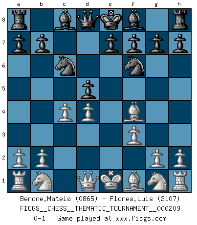 Last move : 0-1 2016 August 9 18:47:44 [Event "FICGS__CHESS__THEMATIC_TOURNAMENT__000209"] [Site "FICGS"] [Date "2016.06.29"] [Round "1"] [White "Benone,Mateia"] [Black "Flores,Luis"] [Result "0-1"] [WhiteElo "0865"] [BlackElo "2107"] 1.d4 Nf6 2.Bg5 Ne4 3.Bf4 c5 4.e3 d5 5.f3 Nf6 6.c4 cxd4 7.exd4 Nc6 0-1 This chess game has been lost on time (started : 2016.06.29 10:20:53) Trompowsky attack (Ruth, Opovcensky Opening) Player Black won this chess game. Follow this game move after move (download)It is no time to be playing Chess when the house is on fire. (Italian Proverb) Moralische Siege zählen nicht. (Savielly Grigorievitsch Tartakower) Solo el jugador con la iniciativa tiene el derecho a atacar. (Wilhelm Steinitz) Les Echecs, c'est l'art de la guerre sans les charniers, c'est la résurrection des morts tombés au champ d'honneur, l'espoir perpétuel, la suprématie de l'intelligence sur la force, la culture de l'esprit. (F. Szpiner) Fame, I have already. Now I need the money. (an elderly Steinitz)