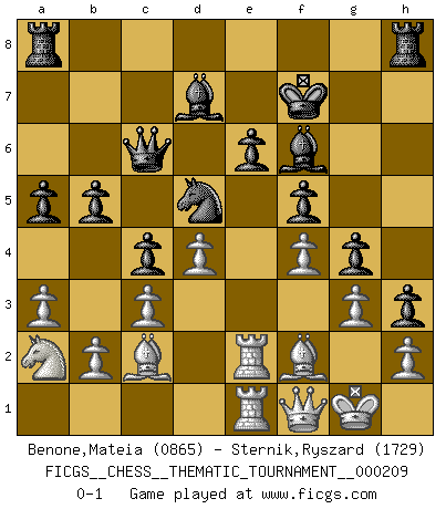 Last move : 0-1 2016 October 29 20:47:16 [Event "FICGS__CHESS__THEMATIC_TOURNAMENT__000209"] [Site "FICGS"] [Date "2016.06.29"] [Round "1"] [White "Benone,Mateia"] [Black "Sternik,Ryszard"] [Result "0-1"] [WhiteElo "0865"] [BlackElo "1729"] 1.d4 Nf6 2.Bg5 Ne4 3.Bf4 c5 4.e3 d5 5.f3 Qa5+ 6.c3 Nf6 7.Bd3 Nc6 8.Nd2 c4 9.Bc2 h6 10.Ne2 g5 11.Bg3 h5 12.O-O h4 13.Bf2 h3 14.g3 g4 15.f4 Qc7 16.e4 dxe4 17.Nxe4 Nd5 18.Re1 Bg7 19.Nc1 f5 20.Ng5 Nd8 21.Ba4+ Bd7 22.Re2 b5 23.Bc2 Qc6 24.Qf1 Nf7 25.a3 Bf6 26.Nxf7 Kxf7 27.Na2 a5 28.Rae1 e6 0-1 Trompowsky attack (Ruth, Opovcensky Opening) Kingside Castling by player White (move 12) Player Black won this chess game. Follow this game move after move (download)Morphy was probably the greatest genius of them all. (Bobby Fischer) Es ist im Leben wie im Schachspiel. Wir entwerfen einen Plan, dieser bleibt jedoch bedingt durch das, was im Schachspiel dem Gegner, im Leben dem Schicksal zu tun belieben wird. (Arthur Schopenhauer) Tu sabes que vas a perder. Aún cuando tenía la ventaja, yo sabía que iba a perder. - al estar jugando con Fischer (Andrew Soltis) La vie est comme un jeu d'échecs : nous esquissons un plan, mais celui-ci est tributaire de ce que daignent faire l'adversaire aux échecs et le destin dans la vie. (Arthur Schopenhauer) Do you know these so called Volunteers don't even get paid! (Simpsons)