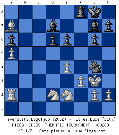 Last move : 1/2-1/2 2016 August 4 20:58:32 [Event "FICGS__CHESS__THEMATIC_TOURNAMENT__000209"] [Site "FICGS"] [Date "2016.06.29"] [Round "1"] [White "Teverovski,Bogoljub"] [Black "Flores,Luis"] [Result "1/2-1/2"] [WhiteElo "2062"] [BlackElo "2107"] 1.d4 Nf6 2.Bg5 Ne4 3.Bf4 c5 4.f3 Qa5+ 5.c3 Nf6 6.d5 Qb6 7.e4 Qxb2 8.Nd2 Qxc3 9.Bc7 d6 10.Bb5+ Bd7 11.a4 c4 12.Ne2 Qb4 13.Qc2 Qc5 14.Qxc4 Qxc4 15.Bxc4 Na6 16.Bxa6 bxa6 17.Kf2 g6 18.Rhb1 Bg7 19.Ra2 O-O 20.Rb7 Bc8 21.Rb8 Rxb8 22.Bxb8 Bd7 23.Bxa7 e6 24.dxe6 fxe6 25.a5 Ng4+ 26.Kg3 1/2-1/2 Trompowsky attack (Ruth, Opovcensky Opening) Kingside Castling by player Black (move 19) This chess game ended in a draw. Follow this game move after move (download)First-class players lose to second-class players because second-class players sometimes play a first-class game. (Siegbert Tarrasch) Schach ist Kampf, hauptsächlich jedoch gegen die eigenen Fehler. (Savielly Grigorievitsch Tartakower) Yo jugué Ajedrez con el y a veces le pude haber ganado solo que siempre devuelve su última jugada y juega la partida de manera diferente. (Mark Twain) Les erreurs sont comme les malheurs, elles n'arrivent jamais seules. (Siegbert Tarrasch) Computer Science is no more about computers than astronomy is about telescopes. (Edsger W. Dijkstra)