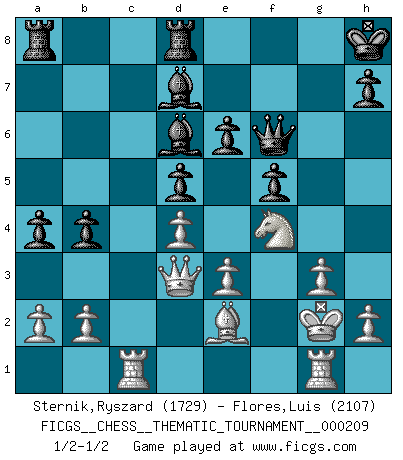 Last move : 1/2-1/2 2016 August 6 19:34:7 [Event "FICGS__CHESS__THEMATIC_TOURNAMENT__000209"] [Site "FICGS"] [Date "2016.06.29"] [Round "1"] [White "Sternik,Ryszard"] [Black "Flores,Luis"] [Result "1/2-1/2"] [WhiteElo "1729"] [BlackElo "2107"] 1.d4 Nf6 2.Bg5 Ne4 3.Bf4 c5 4.f3 Qa5+ 5.c3 Nf6 6.Nd2 cxd4 7.Nc4 Qd8 8.cxd4 b5 9.Nd2 Nc6 10.e3 Nd5 11.Nh3 Nxf4 12.Nxf4 Rb8 13.Rc1 e6 14.Ne4 Na5 15.Kf2 Be7 16.Bd3 O-O 17.Qc2 f5 18.Nc5 g5 19.Ne2 d6 20.Nb3 Nxb3 21.Qxb3 d5 22.f4 Bd6 23.g3 gxf4 24.Nxf4 Qf6 25.Be2 Bd7 26.Rhd1 a5 27.Kg2 Kh8 28.Qc3 Ra8 29.Qd2 b4 30.Nd3 Rg8 31.Rh1 Qh4 32.Nf4 Qh6 33.Rhe1 a4 34.Rg1 Qf6 35.Qd3 Rgd8 1/2-1/2 Trompowsky attack (Ruth, Opovcensky Opening) Kingside Castling by player Black (move 16) This chess game ended in a draw. Follow this game move after move (download)Chess is a terrific way for kids to build self image and self esteem. (Saudin Robovic) Wer mein Gambit spielt, muß bereit sein, alle Brücken hinter sich abzubrechen. Es verändert den ganzen Menschen. Es wirkt wie ein Zauberstab und fördert verkümmerte, gute Charakter- eigenschaften wieder zu Tage. (Emil Joseph Diemer) Yo considero que Fischer es uno de los expertos mas grandes de aperturas de siempre. (Keith Hayward) Demandez au pauvre Cg1 ce qu'il en pense. Eduard Gufeld à propos de la variante Saemisch de l'Est-Indienne. Horse racing is animated roulette. (Roger Kahn)