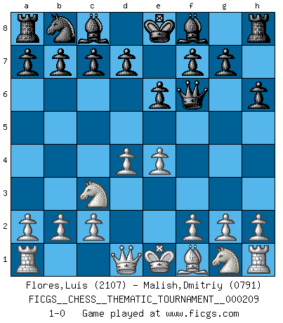 Last move : 1-0 2016 August 10 19:0:56 [Event "FICGS__CHESS__THEMATIC_TOURNAMENT__000209"] [Site "FICGS"] [Date "2016.06.29"] [Round "1"] [White "Flores,Luis"] [Black "Malish,Dmitriy"] [Result "1-0"] [WhiteElo "2107"] [BlackElo "0791"] 1.d4 Nf6 2.Bg5 e6 3.e4 h6 4.Bxf6 Qxf6 5.Nc3 1-0 This chess game has been lost on time (started : 2016.06.29 10:20:53) Trompowsky attack (Ruth, Opovcensky Opening) Player White won this chess game. Follow this game move after move (download)It is peculiar but a fact nevertheless, that gamblers in chess always have enthusiastic followers. (Botvinnik) Ich hatte meine größten Erfolge, als ich 47 Jahre alt war. Kasparow war noch nicht mal 42 und hat das Schach schon im Stich gelassen. (Viktor Kortschnoi) A través de las casillas del tablero, los Indios explican el movimiento del tiempo y la edad, las influencias mas altas que controlan el mundo y los lazos que vinculan al Ajedrez con el alma humana. (Al-Masudi) Nous vivons dans un monde échiquéen : chaque jour qui passe est un défi à relever. (Philosophe Sasha) The difference between perseverance and obstinacy is that one comes from a strong will, and the other from a strong won't. (Henry Ward Beecher)
