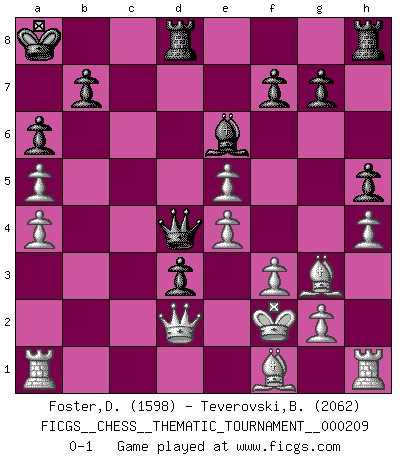 Last move : 0-1 2016 August 28 15:36:11 [Event "FICGS__CHESS__THEMATIC_TOURNAMENT__000209"] [Site "FICGS"] [Date "2016.06.29"] [Round "1"] [White "Foster,Duncan"] [Black "Teverovski,Bogoljub"] [Result "0-1"] [WhiteElo "1598"] [BlackElo "2062"] 1.d4 Nf6 2.Bg5 Ne4 3.Bf4 e5 4.dxe5 d5 5.f3 Nc5 6.e4 d4 7.Nd2 a6 8.Ne2 Nc6 9.Nc1 h5 10.h4 Be7 11.Bg3 Be6 12.Ndb3 Qd7 13.Nxc5 Bxc5 14.Nd3 Bb6 15.a3 O-O-O 16.Qd2 Kb8 17.a4 Ba5 18.b4 Nxb4 19.Nxb4 Ka8 20.c3 c5 21.Kf2 cxb4 22.cxb4 d3 23.bxa5 Qd4+ 0-1 Trompowsky attack (Ruth, Opovcensky Opening) Queenside Castling by player Black (move 15) Player Black won this chess game. Follow this game move after move (download)Fischer Chess play was always razor-sharp, rational and brilliant. One of the best ever. (Dave Regis) Wenn du gegen Bobby spielst, ist es keine Frage von gewinnen oder verlieren. Es ist eine Frage des Überlebens. (Boris Vassilievich Spassky) Existen dos clases de sacrificios: los correctos y los míos. (Mikhail Tal) Pour se monter efficace, un Cavalier a besoin d'avant-postes ! Les Cavaliers font les meilleurs bloqueurs de pions passés. When a man with money meets a man with experience, the man with experience leaves with money and the man with money leaves with experience. (Anonymous)
