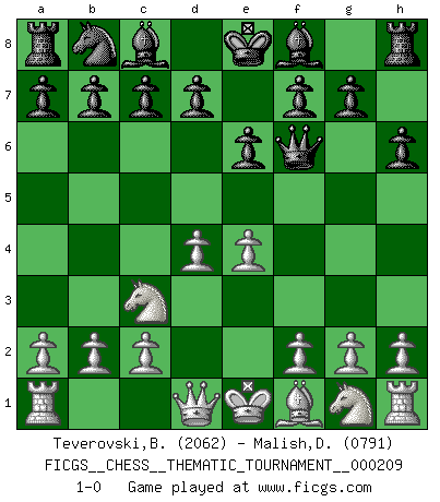 Last move : 1-0 2016 August 9 18:47:44 [Event "FICGS__CHESS__THEMATIC_TOURNAMENT__000209"] [Site "FICGS"] [Date "2016.06.29"] [Round "1"] [White "Teverovski,Bogoljub"] [Black "Malish,Dmitriy"] [Result "1-0"] [WhiteElo "2062"] [BlackElo "0791"] 1.d4 Nf6 2.Bg5 e6 3.e4 h6 4.Bxf6 Qxf6 5.Nc3 1-0 This chess game has been lost on time (started : 2016.06.29 10:20:53) Trompowsky attack (Ruth, Opovcensky Opening) Player White won this chess game. Follow this game move after move (download)If one piece is badly posted, the whole game is bad. (Tarrasch) Sie bekommen vielleicht den Eindruck, dass die Spitzenspieler überhaupt gar nicht so stark sind. Aber das stimmt nicht. Es ist eine Illusion. Mit einem Computer an der Seite ist es sehr leicht, Urteile zu fällen, aber wenn man alleine am Brett sitzt, sieht die Sache ganz anders aus. (Vladimir Kramnik) Aunque la mayoría de la gente disfruta observar las partidas de los grandes Maestros de ataque, algunos de los jugadores mas notables en la historia han sido los jugadores silenciosos posicionales. Lentamente ellos te aplastan despojandote de tu espacio, congestionando tus piezas y dejandote virtualmente sin nada que hacer. (Yasser Seirawan) Vouloir jouer aux échecs contre soi-même est aussi paradoxal que vouloir marcher sur son ombre. (Stefan Zweig) May I never be complete. May I never be content. May I never be perfect. Deliver me, Tyler, from being perfect and complete. (Chuck Palahniuk, Fight Club)