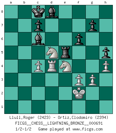 Last move : 1/2-1/2 2016 June 29 22:14:27 [Event "FICGS__CHESS__LIGHTNING_BRONZE__000691"] [Site "FICGS"] [Date "2016.06.29"] [Round "1"] [White "Llull,Roger"] [Black "Ortiz,Clodomiro"] [Result "1/2-1/2"] [WhiteElo "2423"] [BlackElo "2394"] 1.e4 e5 2.Nf3 Nc6 3.Bb5 Nf6 4.O-O Nxe4 5.d4 Nd6 6.Bxc6 dxc6 7.dxe5 Nf5 8.Qxd8+ Kxd8 9.Nc3 Ke8 10.Rd1 Be7 11.b3 Be6 12.g3 h6 13.Bb2 Rd8 14.Kg2 h5 15.Rxd8+ Kxd8 16.h4 c5 17.Ne2 Bd7 18.Nf4 Bc6 19.Rd1+ Kc8 20.Nd5 a5 21.c4 a4 22.Kf1 Re8 23.Rd3 b6 24.Nd2 Kb7 25.Ne4 axb3 26.axb3 Bd8 27.f3 Kc8 28.Kf2 Nd4 29.b4 Rxe5 30.bxc5 bxc5 31.Bxd4 cxd4 32.Rxd4 f6 1/2-1/2 Ruy Lopez : Berlin defense, Open variation Kingside Castling by player White (move 4) This chess game ended in a draw. Follow this game move after move (download)Fischer was a master of clarity and a king of artful positioning. His opponents would see where he was going but were powerless to stop him. (Bruce Pandolfini) Frage des Reporters: -Worin besteht das Ziel von Gambiteröffnungen? Antwort: -Auf Kosten der Partie einen Ruf als Angriffspieler zu erwerben.- (Siegbert Tarrasch) Hay jugadores fuertes y personas amables y yo soy un jugador fuerte. (Bobby Fischer) Vous savez, camarade Pachman, je n'éprouve pas de plaisir à être ministre, je jouerais plutôt aux échecs comme vous, ou alors ferais une révolution au Venezuela. (Che Guevara à Ludek Pachman, 'Checkmate in Prague', 1975) When I took office, only high energy physicists had ever heard of what is called the World Wide Web... Now even my cat has its own page. (Bill Clinton, 1996)