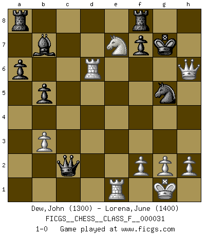 Last move : 1-0 2007 May 9 6:53:8 [Event "FICGS__CHESS__CLASS_F__000031"] [Site "FICGS"] [Date "2007.03.26"] [Round "1"] [White "Dew,John"] [Black "Lorena,June"] [Result "1-0"] [WhiteElo "1300"] [BlackElo "1400"] 1.e4 e5 2.Bb5 a6 3.Ba4 Nc6 4.Nc3 b5 5.Bb3 Nf6 6.Nf3 h6 7.d4 Na5 8.Nxe5 Nxb3 9.axb3 Bb4 10.Bd2 O-O 11.Nd5 Bd6 12.O-O Nxe4 13.Bxh6 gxh6 14.Qg4+ Ng5 15.Qh5 Bxe5 16.dxe5 Kg7 17.Ne3 d6 18.Rad1 Qe7 19.exd6 cxd6 20.Rfe1 Qf6 21.Nd5 Qxb2 22.Ne7 Qxc2 23.Rxd6 Bb7 24.Qxh6+ 1-0 King's pawn game Kingside Castling by player Black (move 10) Kingside Castling by player White (move 12) Player White won this chess game. Follow this game move after move (download)Mistrust is the most necessary characteristic of the Chess player. (Siegbert Tarrasch) Kasparov stellt für gewöhnlich die Regeln auf und bricht sie dann selbst wieder. (Alexej Shirov) Un Peón pasado aumenta su poder a medida de que el número de piezas en el tablero disminuye. (Capablanca) Vous n'êtes pas toujours obligé de jouer le meilleur coup. Un coup doit être actif, entreprenant, correct et beau ! (David Bronstein) Opportunities multiply as they are seized. (Sun Tzu)