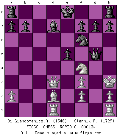 Last move : 0-1 2016 July 21 22:23:48 [Event "FICGS__CHESS__RAPID_C__000134"] [Site "FICGS"] [Date "2016.07.01"] [Round "1"] [White "Di Giandomenico,Alfonso"] [Black "Sternik,Ryszard"] [Result "0-1"] [WhiteElo "1546"] [BlackElo "1729"] 1.e4 e6 2.d4 d5 3.Nd2 c5 4.c3 cxd4 5.cxd4 Bb4 6.Bd3 dxe4 7.Bxe4 Qxd4 8.Qe2 Bxd2+ 9.Bxd2 Nf6 10.Bf3 Qxb2 11.Rd1 Nc6 12.Nh3 Nd4 13.Qd3 Nxf3+ 14.gxf3 Qe5+ 15.Kf1 Bd7 16.Kg2 Qh5 17.Nf4 Qg5+ 18.Kh3 e5 0-1 French : Tarrasch, Open variation Player Black won this chess game. Follow this game move after move (download)What is the difference between chess and football? Everybody understands football, but nobody plays it. Everybody plays chess, but nobody understands it. Everything is relative. (Vladimir Kramnik) Capablanka war das größte Genie der Schachgeschichte! Aber denken sie nicht er habe nichts vom Schach verstanden. Er wusste nur soviel wie er wissen musste um seine Ziele zu erreichen. (Mikhail Moiseyevich Botvinik) Yo he agregado estos principios a la ley: pongan los Caballos en acción antes de que los dos Alfiles sean desarrollados. (Emanuel Lasker) Aidez vos pièces, elles vous aideront. (Paul Morphy) Whenever people agree with me, I always feel I must be wrong. (Oscar Wilde)