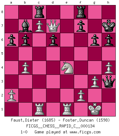 Last move : 1-0 2016 August 5 16:39:26 [Event "FICGS__CHESS__RAPID_C__000134"] [Site "FICGS"] [Date "2016.07.01"] [Round "1"] [White "Faust,Dieter"] [Black "Foster,Duncan"] [Result "1-0"] [WhiteElo "1685"] [BlackElo "1598"] 1.c4 b6 2.Nf3 Bb7 3.g3 g6 4.Nc3 Bg7 5.Bg2 e6 6.O-O Ne7 7.d4 h6 8.d5 exd5 9.cxd5 d6 10.e4 Nd7 11.Be3 O-O 12.Re1 a6 13.Rc1 Kh7 14.h4 Nf6 15.b4 Bc8 16.e5 Ng4 17.exd6 cxd6 18.Bd4 Bxd4 19.Nxd4 Ne5 20.Nc6 Bg4 21.Qd4 N7xc6 22.dxc6 Nf3+ 23.Bxf3 Bxf3 24.c7 Qd7 25.Qf6 Bb7 26.Qe7 Qh3 27.Ne4 Rac8 28.Qd7 1-0 English Opening Kingside Castling by player White (move 6) Kingside Castling by player Black (move 11) Player White won this chess game. Follow this game move after move (download)Nothing excites jaded Grandmasters more than a theoretical novelty. (Dominic Lawson) Das Schach hält seine Meister in eigenen Banden, Fesseln; auf vielerlei Weise formt es ihren Geist, so dass die innere Freiheit selbst des Stärksten beeinflusst wird. (Albert Einstein) Tu puedes aprender mucho mas de una partida que pierdas que de una partida ganada. Tendras que perder cientos de partidas antes de llegar a ser un buen jugador. (Jose Raul Capablanca) Il n'y a pas de prix trop élevé au scalp de l'ennemi. (Koblentz) Internet: Absolute communication, absolute isolation. (Paul Carvel)