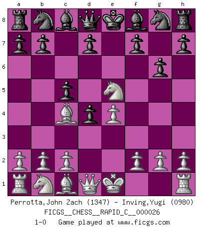 Last move : 1-0 2007 April 10 3:53:10 [Event "FICGS__CHESS__RAPID_C__000026"] [Site "FICGS"] [Date "2007.03.26"] [Round "1"] [White "Perrotta,John Zach"] [Black "Inving,Yugi"] [Result "1-0"] [WhiteElo "1347"] [BlackElo "0980"] 1.e4 e5 2.d4 exd4 3.Nf3 c5 4.Bc4 g6 5.Ne5 1-0 Centre game Player White won this chess game. Follow this game move after move (download)If a ruler does not understand Chess, how can he rule over a kingdom ? (King Khusros II) Mein Name ist Rustam Kamsky. Sie haben meinen Sohn belästigt. Bereiten Sie sich aufs Sterben vor. (Rustam Kamsky) Nunca antes ha habido un jugador de Ajedrez con tal conocimiento a fondo de las complejidades del juego y una inmensa voluntad absolutamente indomable de ganar. Yo pienso que Fischer es el jugador mas grande que jamás haya existido. (Lisa Lane) Des points faibles ou des trous dans la position de l'adversaire doivent être occupés par des pièces et non pas par des pions. (Siegbert Tarrasch) They say in chess you've got to kill the queen, and then you mate it... Oh I, do you ? (Red Hot Chili Peppers, Fortune faded)