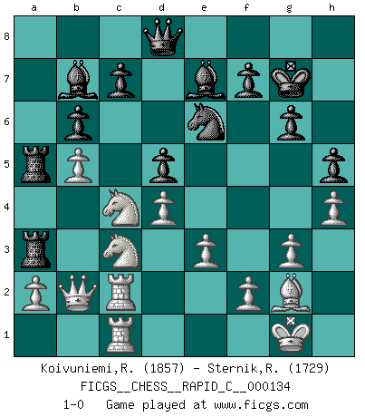 Last move : 1-0 2016 September 19 23:11:20 [Event "FICGS__CHESS__RAPID_C__000134"] [Site "FICGS"] [Date "2016.07.01"] [Round "1"] [White "Koivuniemi,Raimo"] [Black "Sternik,Ryszard"] [Result "1-0"] [WhiteElo "1857"] [BlackElo "1729"] 1.d4 Nf6 2.c4 e6 3.Nf3 d5 4.Nc3 Be7 5.Bg5 h6 6.Bh4 O-O 7.e3 b6 8.Be2 Bb7 9.Bxf6 Bxf6 10.cxd5 exd5 11.b4 Qd6 12.Rb1 Nc6 13.Qb3 a5 14.b5 Nd8 15.O-O Ne6 16.h4 h5 17.g3 Rfe8 18.Rfd1 Rad8 19.Bd3 g6 20.Rdc1 Rd7 21.Bf1 Rde7 22.Bg2 Rd7 23.Rc2 R7d8 24.Ne2 Kg7 25.Qb2 Be7 26.Ne5 Rc8 27.Qb3 a4 28.Qxa4 Ra8 29.Qb3 Ra3 30.Qb2 Rea8 31.Nc3 Qd8 32.Rbc1 R8a5 33.Nc4 1-0 Queen's pawn game Kingside Castling by player Black (move 6) Kingside Castling by player White (move 15) Player White won this chess game. Follow this game move after move (download)Nowadays, when you're not a grandmaster at 14, you can forget about it. (Anand Viswanathan) Es war undenkbar für die Behörden, dass ein sowjetischer Großmeister auf diese Art und Weise [Fischer-Taimanov 6:0] verliert, ohne dass es eine politischer Erklärung dafür gäbe. (Mark Taimanov) Realmente no sabemos como el juego fue inventado, aunque hay sospechas. Tan pronto como descubramos a los culpables, se los haremos saber. (Bruce Pandolfini) Lorsque vous vous retrouvez devant une position atroce, ne tendez pas un ultime piège dérisoire avec l'intention d'abandonner si l'adversaire le déjoue ! Faites-vous plutôt un devoir de résister comme si votre vie en dépendait. Jouez le coup qui vous déplairait au centuple si vous étiez dans la peau de votre tortionnaire ! If you work for a living, why do you kill yourself working ? (Tuco to a chicken in The Good, The Bad and The Ugly)