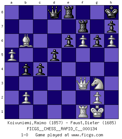 Last move : 1-0 2016 September 19 16:23:44 [Event "FICGS__CHESS__RAPID_C__000134"] [Site "FICGS"] [Date "2016.07.01"] [Round "1"] [White "Koivuniemi,Raimo"] [Black "Faust,Dieter"] [Result "1-0"] [WhiteElo "1857"] [BlackElo "1685"] 1.d4 e6 2.e4 d5 3.Nd2 Nf6 4.e5 Nfd7 5.Ngf3 c5 6.c3 b6 7.Bb5 Ba6 8.Bxa6 Nxa6 9.O-O Be7 10.Re1 O-O 11.h3 Nab8 12.Qe2 Nc6 13.Nf1 Rb8 14.Ng3 c4 15.Nh2 Kh8 16.Qg4 b5 17.Nf3 b4 18.Ng5 Qc8 19.f4 Bxg5 20.fxg5 a5 21.Rf1 Rb7 22.Rf4 Re8 23.a4 Qa8 24.Qh5 Nd8 25.Bd2 Nf8 26.Raf1 Qa7 27.h4 Ng6 28.R4f2 Nc6 29.Qg4 Ngxe5 30.dxe5 Nxe5 31.Qe2 Nd3 32.Be3 Qb8 33.Rf3 Ne5 34.cxb4 axb4 35.h5 Nxf3+ 36.Qxf3 Qd8 37.h6 g6 38.a5 f5 39.gxf6 Rf7 40.Bb6 1-0 Queen's pawn Kingside Castling by player White (move 9) Kingside Castling by player Black (move 10) Player White won this chess game. Follow this game move after move (download)I play correspondence chess because it is both art and science while chess is art only. (A player at FICGS) Die jungen Leute sollen verstehen, dass sie noch etwas von mir lernen können und müssen. (Viktor Kortschnoi) En manos de Fischer's, una diminuta ventaja teórica es tan buena como tener una Reina de ventaja. (Isaac Kashdan) Il vaut toujours mieux jouer un plan faux de façon logique que de n'avoir pas de plan du tout. (Victor Kortchnoï) Those parts of the system that you can hit with a hammer (not advised) are called hardware; those program instructions that you can only curse at are called software. (Anonymous)