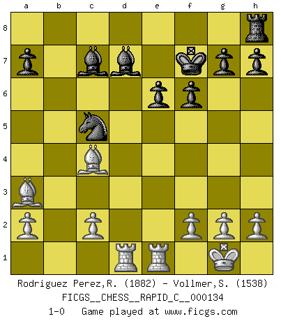Last move : 1-0 2016 September 20 10:52:13 [Event "FICGS__CHESS__RAPID_C__000134"] [Site "FICGS"] [Date "2016.07.01"] [Round "1"] [White "Rodriguez Perez,Rene"] [Black "Vollmer,Steve"] [Result "1-0"] [WhiteElo "1882"] [BlackElo "1538"] 1.e4 e6 2.d4 d5 3.Bd3 dxe4 4.Bxe4 Nf6 5.Bf3 c5 6.Ne2 Nc6 7.Be3 Qb6 8.Nbc3 cxd4 9.Nxd4 Nxd4 10.Qxd4 Qxd4 11.Bxd4 Bd7 12.Bxb7 Rb8 13.Ba6 Rxb2 14.O-O Bd6 15.Ne4 Nxe4 16.Bxb2 f6 17.Rfe1 Nc5 18.Rad1 Bc7 19.Bc4 Kf7 20.Ba3 1-0 French : Schlechter variation Kingside Castling by player White (move 14) Player White won this chess game. Follow this game move after move (download)Without error there can be no brilliancy. (Emanuel Lasker) Ich hatte Angst gegen einen russischen Großmeister zu verlieren, und er befürchtete gegen einen kleinen Jungen zu verlieren. (über ein Remis gegen Juri Awerbach). (Robert James Fischer) Debió haber existido una vez en que los hombres eran semidióses, de otra manera no hubiesen podido inventar el Ajedrez. (Gustav Schenk) Des combinaisons [dans le jeu d'échecs] pareilles à des mélodies. Je crois entendre pour ainsi dire la musique des coups... (Vladimir Nabokov) It's not enough to succeed. Others must fail. (Gore Vidal)