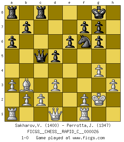 Last move : 1-0 2007 May 17 3:38:2 [Event "FICGS__CHESS__RAPID_C__000026"] [Site "FICGS"] [Date "2007.03.26"] [Round "1"] [White "Sakharov,Vitalij"] [Black "Perrotta,John Zach"] [Result "1-0"] [WhiteElo "1400"] [BlackElo "1347"] 1.e4 d5 2.exd5 Qxd5 3.Nf3 Nf6 4.Nc3 Qa5 5.Bc4 Bg4 6.d3 e6 7.O-O Bd6 8.h3 Bh5 9.a3 Nbd7 10.Nb5 a6 11.Nxd6+ cxd6 12.Bf4 d5 13.Bb3 O-O 14.g4 Bg6 15.Nh4 Nc5 16.Nxg6 hxg6 17.Bd6 Rfc8 18.Bxc5 Qxc5 19.Kg2 1-0 This chess game has been lost on time (started : 2007.03.26 10:15:57) Scandinavian (centre counter) defense Kingside Castling by player White (move 7) Kingside Castling by player Black (move 13) Player White won this chess game. Follow this game move after move (download)Blessed be the memory of him who gave the world this immortal game. (A. G. Gardiner) Es ist nicht das erste mal, dass sich die FIDE dem Arabischen Geld gebeugt hat (über die FIDE WM 2004 in Lybien). (Larry Evans) De todos mis libros Rusos, la defensa contiene y difunde el 'calor' mas grande que pudiese verse extraño al observar lo supremamente abstracto que el Ajedrez supuestamente es. (Vladimir Nabokov) Un journaliste : 'Vous préférez avoir une dame de plus sur l'échiquier ou au lit ?' Boris Spassky : 'Ca dépend de la position.' Tree pose grows confidence. It roots me to this world. (Terri Guillemets)