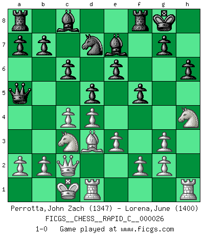 Last move : 1-0 2007 June 14 1:27:4 [Event "FICGS__CHESS__RAPID_C__000026"] [Site "FICGS"] [Date "2007.03.26"] [Round "1"] [White "Perrotta,John Zach"] [Black "Lorena,June"] [Result "1-0"] [WhiteElo "1347"] [BlackElo "1400"] 1.d4 Nf6 2.Nf3 c6 3.c4 e6 4.Nc3 d5 5.Bg5 Be7 6.e3 h6 7.Bh4 O-O 8.Bd3 Nbd7 9.Bg3 Nh5 10.Qc2 f5 11.O-O-O Nxg3 12.hxg3 Qa5 13.Nh4 1-0 This chess game has been lost on time (started : 2007.03.26 10:15:57) Queen's pawn game Kingside Castling by player Black (move 7) Queenside Castling by player White (move 11) Player White won this chess game. Follow this game move after move (download)Fischer wanted to give the Russians a taste of their own medicine. (Larry Evans) Schach ist ein Reich, wo sich die menschliche Phantasie frei entfalten kann. (David Bronstein) Una partida de Ajedrez se divide en 3 etapas: la primera cuando piensas que tienes la ventaja, la segunda cuando crees que tienes la ventaja y la tercera... ¡cuando te das cuenta que vas a perder!. (Savielly Tartakower) Karpov est une pièce de musée. (Garry Kasparov) Bobby never cared about money, though. His only desire was to prove that his choices were correct: He wanted chess to be important because he was a chess player, and he wanted to be important. Bobby knew money was important, but he didn't have a clue why, outside of clothes and status. The only way he could accomplish what he wanted was to fight for a lot of money. Once he got it, he gave it away. He did not know how to spend it. And once he'd become champion, after, essentially, sacrificing his life for it, he didn't know how to spend his time. (Bob Wade)