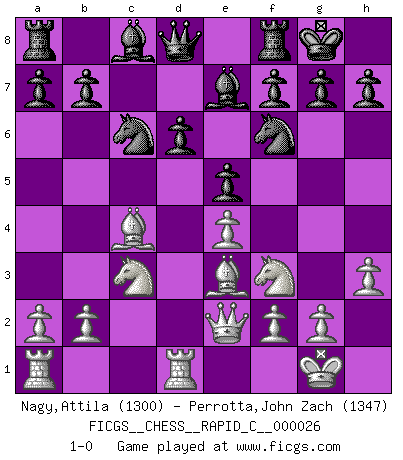 Last move : 1-0 2007 May 15 21:15:49 [Event "FICGS__CHESS__RAPID_C__000026"] [Site "FICGS"] [Date "2007.03.26"] [Round "1"] [White "Nagy,Attila"] [Black "Perrotta,John Zach"] [Result "1-0"] [WhiteElo "1300"] [BlackElo "1347"] 1.e4 c5 2.Nf3 Nc6 3.d4 cxd4 4.c3 dxc3 5.Nxc3 d6 6.Bc4 e6 7.O-O Nf6 8.Qe2 Be7 9.Rd1 e5 10.h3 O-O 11.Be3 1-0 This chess game has been lost on time (started : 2007.03.26 10:15:57) Sicilian defense Kingside Castling by player White (move 7) Kingside Castling by player Black (move 10) Player White won this chess game. Follow this game move after move (download)A good player is always lucky. (Jose Raul Capablanca) Über Karpov: Er war und ist ein Vertreter der russischen Reaktionäre. Das steckt tief in seiner Seele, wehalb ich nicht nett mit ihm umgehen kann. (Viktor Kortschnoi) Siempre es mucho mejor sacrificar las piezas de tu oponente. (Savielly Tartakover) Assurément je connaissais par expérience le mystérieux attrait de ce jeu royal, le seul entre tous les jeux inventés par les hommes qui échappe souverainement à la tyrannie du hasard, le seul où l'on ne doive sa victoire qu'à son intelligence ou plutôt à une certaine forme d'intelligence. Mais n'est-ce pas déjà le limiter injurieusement que d'appeler les échecs un jeu ? N'est-ce pas une science, un art ou quelque chose qui, comme le cercueil de Mahomet entre ciel et terre, est suspendu entre l'un et l'autre, et qui réunit un nombre incroyable de contraires ? [...] C'est une pensée qui ne mène à rien, une mathématique qui n'établit rien, un art qui ne laisse pas d'uvre, une architecture sans matière; et il l'a prouvé néanmoins qu'il était plus durable, à sa manière, que les livres ou que tout autre monument, ce jeu unique qui appartient à tous les peuples et à tous les temps, et dont personne ne sait quel dieu en fit don à la terre pour tuer l'ennui, pour aiguiser l'esprit et stimuler l'âme. Où commence-t-il, où finit-il ? (Stefan Zweig) The Internet is the first thing that humanity has build that humanity doesn't understand, the largest experiment in anarchy that we have ever had. (Eric Schmidt)