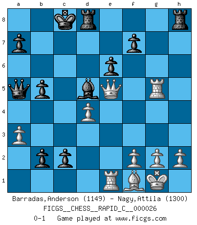 Last move : 0-1 2007 April 9 15:45:56 [Event "FICGS__CHESS__RAPID_C__000026"] [Site "FICGS"] [Date "2007.03.26"] [Round "1"] [White "Barradas,Anderson"] [Black "Nagy,Attila"] [Result "0-1"] [WhiteElo "1149"] [BlackElo "1300"] 1.d4 d5 2.c4 c6 3.Nf3 Nf6 4.Nc3 e6 5.Bg5 dxc4 6.a3 Nbd7 7.e4 b5 8.e5 h6 9.Bxf6 gxf6 10.Be2 Bg7 11.exf6 Bxf6 12.O-O Bb7 13.b3 cxb3 14.Re1 Nc5 15.Bf1 Qa5 16.Ne4 Nxe4 17.Rxe4 c5 18.Rf4 Bg5 19.Nxg5 hxg5 20.Rg4 c4 21.Rxg5 Bd5 22.Qe2 O-O-O 23.Qe5 c3 24.Rc1 b2 25.Re1 c2 0-1 QGD Slav : 4.Nc3 Kingside Castling by player White (move 12) Queenside Castling by player Black (move 22) Player Black won this chess game. Follow this game move after move (download)Chess, like love, is infectious at any age. (Flohr) Den Ruhm habe ich schon, jetzt brauche ich noch das Geld. (Wilhelm Steinitz) Solo existe una cosa que Fischer hace en el Ajedrez sin placer: ¡perder!. (Boris Spassky) La vérité est comme le meilleur coup aux échecs : elle existe, mais il faut la chercher. (Arturo Perez-Reverte) Wawaweewa ! (Borat: Cultural learnings of America for make benefit glorious nation of Kazakhstan)
