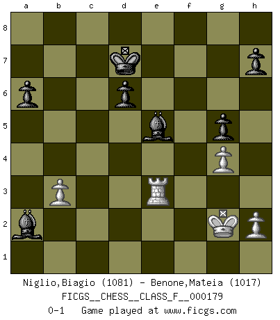 Last move : 0-1 2016 November 6 17:34:39 [Event "FICGS__CHESS__CLASS_F__000179"] [Site "FICGS"] [Date "2016.07.13"] [Round "1"] [White "Niglio,Biagio"] [Black "Benone,Mateia"] [Result "0-1"] [WhiteElo "1081"] [BlackElo "1017"] 1.e4 c5 2.d4 cxd4 3.c3 Nf6 4.e5 Nd5 5.Nf3 Nc6 6.cxd4 d6 7.Bc4 Nb6 8.Bb5 g6 9.d5 a6 10.Bxc6+ bxc6 11.dxc6 Bg7 12.exd6 Qxd6 13.Qxd6 exd6 14.O-O Be6 15.Nbd2 Rc8 16.Nb3 Rxc6 17.Nbd4 Rc8 18.Re1 Kd7 19.b3 Bd5 20.Rb1 Rhe8 21.Be3 Ba8 22.Rbd1 Nd5 23.Bd2 Rxe1+ 24.Rxe1 Nc3 25.Bxc3 Rxc3 26.Kf1 Rd3 27.Re3 Rxd4 28.Nxd4 Bxd4 29.Rd3 Be5 30.g3 Be4 31.Re3 f5 32.g4 g5 33.f3 Bb1 34.Kg2 fxg4 35.fxg4 Bxa2 0-1 Sicilian : Smith-Morra gambit Kingside Castling by player White (move 14) Player Black won this chess game. Follow this game move after move (download)My God, Bobby Fischer plays so simply. (Alexei Suetin) Ich verstehe den Grund nicht, warum die Aufteilung in Frauen und Männer überhaupt im Schach besteht. (Judith Polgar) Bobby es la celebridad menos entendida y malinterpretada que camina el la faz de esta tierra. (Yasser Seirawan) Le génie consiste à savoir transgresser les règles au moment opportun. (Teichmann) Man with more than one clock never knows what time it is. (Chinese thought)