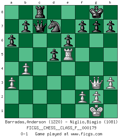 Last move : 0-1 2016 August 4 1:20:21 [Event "FICGS__CHESS__CLASS_F__000179"] [Site "FICGS"] [Date "2016.07.13"] [Round "1"] [White "Barradas,Anderson"] [Black "Niglio,Biagio"] [Result "0-1"] [WhiteElo "1220"] [BlackElo "1081"] 1.e4 c6 2.d4 d5 3.e5 c5 4.c3 Nc6 5.Bb5 Bd7 6.Nf3 e6 7.Bf4 Nxe5 8.Bxd7+ Nxd7 9.Ne5 cxd4 10.cxd4 Bb4+ 11.Nc3 Ngf6 12.O-O O-O 13.a3 Ba5 14.b4 Bc7 15.Re1 a6 16.Nxd7 Qxd7 17.Qf3 Bxf4 18.Qxf4 Rac8 19.Qf3 Rc4 20.Rac1 Rxd4 21.Na4 Qxa4 22.Rc7 Qb5 23.Qg3 Rc4 24.h3 Rxc7 25.Qxc7 Qd7 26.Qc3 Rc8 27.Qg3 Qc7 28.Re5 Nd7 0-1 Caro-Kann : Advance variation Kingside Castling by player White (move 12) Kingside Castling by player Black (move 12) Player Black won this chess game. Follow this game move after move (download)Chess is like life. (Boris Spassky) Als er Schachweltmeister wurde ließ er praktisch alle stärksten Sovietspieler für sich arbeiten. Wenn ein auch nur mittelmässiger Meister ein Spezialist für eine bestimmte Eröffnung war, wurde er von Karpov gerufen. Das wurde alles geheim gehalten. (Mikhail Moiseyevich Botvinik) El Ajedrez es un cuento de Hadas de las 1001 metidas de pata. (Savielly Tartakower) L'action d'une oeuvre littéraire se déroule sur un champ de bataille. Les masques et les types du drame moderne correspondent aux pièces du jeu d'échecs. L'intrigue correspond aux coups et aux gambits, c'est à dire aux techniques du jeu telles qu'utilisées et interprétées par les joueurs. Les tactiques et les péripéties [mouvements] correspondent aux coups exécutés par l'adversaire. (Viktor Shklovsky) There are two major products that came out of Berkeley: LSD and UNIX. We do not believe this is to be a coincidence. (Jeremy S. Anderson)