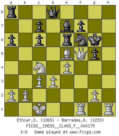 Last move : 1-0 2016 September 3 17:31:24 [Event "FICGS__CHESS__CLASS_F__000179"] [Site "FICGS"] [Date "2016.07.13"] [Round "1"] [White "Ethier,Donald V."] [Black "Barradas,Anderson"] [Result "1-0"] [WhiteElo "1365"] [BlackElo "1220"] 1.f4 Nc6 2.Nf3 d6 3.e3 e5 4.e4 Bg4 5.Bb5 a6 6.Bxc6+ bxc6 7.fxe5 dxe5 8.d3 Bc5 9.Nbd2 Nf6 10.Qe2 O-O 11.Nc4 Bxf3 12.Qxf3 Re8 13.Bg5 Re6 14.O-O-O h6 15.Bh4 g5 16.Bg3 Bd4 17.Rdf1 Kg7 18.c3 Bc5 19.Bxe5 Be7 20.h4 Kg6 21.hxg5 hxg5 22.Qf5+ 1-0 Bird's Opening Kingside Castling by player Black (move 10) Queenside Castling by player White (move 14) Player White won this chess game. Follow this game move after move (download)By the beauty of his games, the clarity of his play, and the brilliance of his ideas, Fischer made himself an artist of the same stature as Brahms, Rembrandt, and Shakespeare. (David Levy) Pläne sind die Träume des Verständigen. (Ernst Freiherr von Feuchtersleben) El estómago es una parte esencial del maestro de Ajedrez. (Bent Larsen) A ce moment-là, je menaçais de comprendre la position ! (Clément L'Heureux) It's not the size of the dog in the fight, it's the size of the fight in the dog. (Mark Twain)