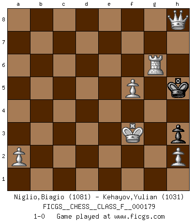 Last move : 1-0 2017 January 3 19:27:31 [Event "FICGS__CHESS__CLASS_F__000179"] [Site "FICGS"] [Date "2016.07.13"] [Round "1"] [White "Niglio,Biagio"] [Black "Kehayov,Yulian"] [Result "1-0"] [WhiteElo "1081"] [BlackElo "1031"] 1.e4 e5 2.Nf3 d6 3.d4 exd4 4.Nxd4 c5 5.Bb5+ Bd7 6.Bxd7+ Qxd7 7.Nf3 Nf6 8.Nc3 Be7 9.O-O O-O 10.Qe2 Nc6 11.Rd1 Qc7 12.Bf4 Ne5 13.Nd5 Nxd5 14.Rxd5 Nxf3+ 15.Qxf3 b6 16.Rad1 Rfd8 17.Qd3 Qc6 18.Bxd6 Bxd6 19.Rxd6 Rxd6 20.Qxd6 Qxd6 21.Rxd6 h6 22.f4 b5 23.b3 c4 24.bxc4 bxc4 25.Rc6 Re8 26.Rxc4 f6 27.Kf2 Re7 28.Kf3 g5 29.g3 gxf4 30.gxf4 Kf7 31.f5 h5 32.Rc8 Kg7 33.c4 a6 34.c5 Kh7 35.c6 Kg7 36.c7 Rxc7 37.Rxc7+ Kh6 38.Ra7 a5 39.Rxa5 Kg5 40.Ra6 h4 41.Rxf6 h3 42.Rg6+ Kh5 43.e5 Kh4 44.e6 Kh5 45.e7 Kh4 46.e8Q Kh5 47.Qh8+ 1-0 Philidor : Exchange variation Kingside Castling by player White (move 9) Kingside Castling by player Black (move 9) 10 pieces endgame at move 37 : White KRPPPP , Black KPPP WHITE : King + 1 Rook 4 Pawns BLACK : King + 3 Pawns 9 pieces endgame at move 39 : White KRPPPP , Black KPP WHITE : King + 1 Rook 4 Pawns BLACK : King + 2 Pawns 8 pieces endgame at move 41 : White KRPPPP , Black KP WHITE : King + 1 Rook 4 Pawns BLACK : King + 1 Pawn Promotion Queen by player White (move 46) Player White won this chess game. Follow this game move after move (download)The stomach is an essential part of the Chess master. (Bent Larsen) Im Wettkampf zwischen starken Meistern kommen Fehler sehr selten vor, deshalb ist es mit bloßem Warten nicht getan. (José Raúl Capablanca) En un gambito tu regalas un Peón por el bién de tomar un juego perdido. (Samuel Standige Boden) Il n'y a pas eu de défaite parce que je ne crois pas que cet ordinateur ait jamais existé. IBM a triché en refusant d'imprimer les modes de recherche de la machine. C'est évident, pendant le match, des coups décisifs ont été joués par des êtres humains. Aujourd'hui, les meilleurs spécialistes en informatique ne peuvent toujours pas expliquer comment Deep-Blue a pu jouer contre la logique des ordinateurs. IBM a gagné une guerre de communication, mais ils sont incapables de prouver que l'ordinateur a gagné tout seul. (Garry Kasparov) If you are good, you will be assigned all the work. If you are really good, you will get out of it. (Dan Rotaru)