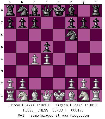 Last move : 0-1 2016 August 23 20:33:3 [Event "FICGS__CHESS__CLASS_F__000179"] [Site "FICGS"] [Date "2016.07.13"] [Round "1"] [White "Bromo,Alexis"] [Black "Niglio,Biagio"] [Result "0-1"] [WhiteElo "1022"] [BlackElo "1081"] 1.d4 d5 2.c4 e5 3.e3 exd4 4.exd4 Nf6 0-1 This chess game has been lost on time (started : 2016.07.13 10:23:6) QGD : Albin counter-gambit Player Black won this chess game. Follow this game move after move (download)When you see a good move, look for a better one. (Emanuel Lasker) Mutter, ich bin eben Ex-Weltmeister geworden. --beim nach Hause Kommen nach dem Verlust des WM-Titels an Mihail Botvinnik -- (Mikhail Nekhemyevich Tal) Es el objetivo de la escuela moderna no tratar cada posición de acuerdo a una regla general, sino de acuerdo al principio inherente en la posición. (Richard Reti) Avant la finale, les dieux ont créé le milieu de partie. (Tarrasch) Heh, heh, heh. Time to abandon ship. (General Grievous in Star Wars ep.3)