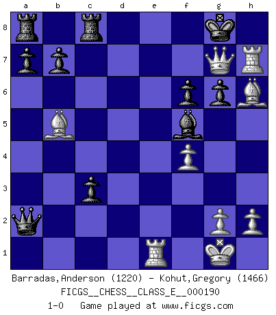 Last move : 1-0 2016 December 7 2:0:54 [Event "FICGS__CHESS__CLASS_E__000190"] [Site "FICGS"] [Date "2016.07.16"] [Round "1"] [White "Barradas,Anderson"] [Black "Kohut,Gregory"] [Result "1-0"] [WhiteElo "1220"] [BlackElo "1466"] 1.e4 c5 2.Nf3 Nc6 3.d4 cxd4 4.Nxd4 g6 5.Nc3 Bg7 6.Be3 Nf6 7.Bd3 O-O 8.Qf3 Nd5 9.Nxc6 Bxc3+ 10.bxc3 dxc6 11.exd5 cxd5 12.Bh6 Re8 13.O-O e6 14.Qg3 Qe7 15.Qe5 f6 16.Qg3 e5 17.Rfe1 Be6 18.f4 e4 19.Bb5 Rec8 20.c4 dxc4 21.Rxe4 Qf7 22.Rae1 Bf5 23.Re7 Qd5 24.Rg7+ Kh8 25.R1e7 Qd1+ 26.Re1 Qxc2 27.Qe3 Qxa2 28.Qe7 c3 29.Rxh7+ Kg8 30.Qg7+ 1-0 Sicilian : Accelerated Fianchetto, Modern variation Kingside Castling by player Black (move 7) Kingside Castling by player White (move 13) Player White won this chess game. Follow this game move after move (download)I guess a certain amount of temperament is expected of Chess geniuses. (Ron Gross) Mit sehr nachdenklichem Gesicht schreitet Bobby durch den Turniersaal. Was ist passiert?, fragt Lombardy. Ich stehe schlecht, antwortet Fischer. Lombardy: Dann biete doch einfach Remis an. Fischer: So schlecht stehe ich nun auch wieder nicht! (Robert James Fischer) Tu sabes que vas a perder. Aún cuando tenía la ventaja, yo sabía que iba a perder. - al estar jugando con Fischer (Andrew Soltis) Le jeu d'échecs fait naître et fortifie en nous plusieurs qualités précieuses dans le cours de l'existence, telles que la prévoyance, la circonspection, la prudence, et la persévérance. (Benjamin Franklin - 1783, la morale des échecs) In every real man a child is hidden that wants to play. (Friedrich Nietzsche)