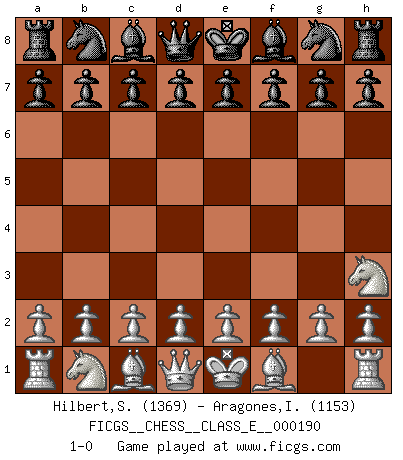 Last move : 1-0 2016 August 28 21:9:49 [Event "FICGS__CHESS__CLASS_E__000190"] [Site "FICGS"] [Date "2016.07.16"] [Round "1"] [White "Hilbert,Stephan J."] [Black "Aragones,Inti"] [Result "1-0"] [WhiteElo "1369"] [BlackElo "1153"] 1.Nh3 1-0 This chess game has been lost on time (started : 2016.07.16 4:17:44) Amar (Paris) Opening Player White won this chess game. Follow this game move after move (download)A win by an unsound combination, however showy, fills me with artistic horror. (Wilhelm Steinitz) Der Umstand, daß uns eine 7 Stunden Zeitkontrolle ermöglicht eine großartige, tiefe Partie zu spielen, ist für die Massenmedien nicht weiter von Bedeutung. (Alexej Shirov) Al jugar al Ajedrez entonces, podemos aprender: Primero: Previsión... Segundo: Prudencia... Tercero: Cautela... Y al final, aprendemos del Ajedrez el hábito de no ser desanimados por apariencias malas presentes en el estado de nuestros asuntos, el hábito de la esperanza por una oportunidad favorable y la perseveración de los secretos de los recursos. (Benjamin Franklin) A ce moment-là, je menaçais de comprendre la position ! (Clément L'Heureux) The meaning of life is that it is to be lived, and it is not to be traded and conceptualized and squeezed into a pattern of systems. (Bruce Lee)