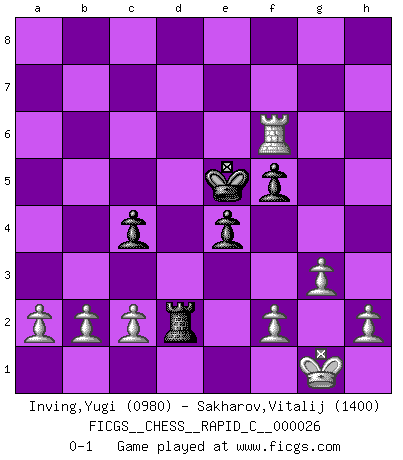 Last move : 0-1 2007 May 23 4:14:23 [Event "FICGS__CHESS__RAPID_C__000026"] [Site "FICGS"] [Date "2007.03.26"] [Round "1"] [White "Inving,Yugi"] [Black "Sakharov,Vitalij"] [Result "0-1"] [WhiteElo "0980"] [BlackElo "1400"] 1.g3 c6 2.Bg2 d5 3.d4 Bf5 4.Nf3 Nd7 5.Bf4 e6 6.O-O Ngf6 7.Nc3 h6 8.Ne5 Nxe5 9.dxe5 Bc5 10.exf6 Qxf6 11.e4 dxe4 12.Nxe4 Bxe4 13.Bxe4 Rd8 14.Qf3 Bd6 15.Bxd6 Rxd6 16.Qxf6 gxf6 17.Rfd1 Ke7 18.Rxd6 Kxd6 19.Rd1+ Kc7 20.Bf3 f5 21.Bh5 Rf8 22.Rd4 f6 23.Ra4 Rd8 24.Rxa7 Rd2 25.Bf7 e5 26.Bb3 e4 27.Ra5 b5 28.Ra7+ Kd6 29.Rh7 c5 30.Rxh6 c4 31.Bxc4 bxc4 32.Rxf6+ Ke5 0-1 Benko's Opening Kingside Castling by player White (move 6) Player Black won this chess game. Follow this game move after move (download)Help your pieces so they can help you. (Paul Morphy) Im Blitz ist es einfacher mit einer Figur weniger anzugreifen, als sich mit einer Mehrfigur zu verteidigen. (Mikhail Nekhemyevich Tal) La caracteristica mas importante en la posición del Ajedrez es la actividad de las piezas. Esto es absolutamente fundamental en todas las fases del juego: Apertura, Juego Medio y especialmente Finales. La limitación primordial en la actividad de una pieza, es la estructuración de los Peones. (Michael Stean) Horreur, mais aussi harmonie suprême : qu'y avait-il en effet au monde en dehors des échecs ? Le brouillard, l'inconnu, le non-être... (Vladimir Nabokov) It's unlucky to be superstitious. (Dave Enteles)