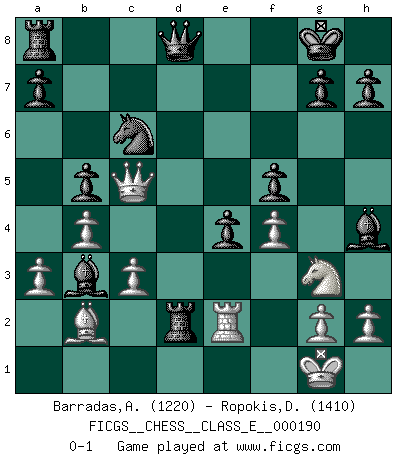 Last move : 0-1 2016 August 4 12:41:26 [Event "FICGS__CHESS__CLASS_E__000190"] [Site "FICGS"] [Date "2016.07.16"] [Round "1"] [White "Barradas,Anderson"] [Black "Ropokis,Dimitrios"] [Result "0-1"] [WhiteElo "1220"] [BlackElo "1410"] 1.e4 c5 2.Nf3 Nf6 3.d4 cxd4 4.Nxd4 Nxe4 5.Bd3 Nc5 6.O-O Nxd3 7.Qxd3 Nc6 8.Nf3 d5 9.Nc3 e6 10.Re1 Be7 11.Nb5 f6 12.b3 O-O 13.Nc3 Nb4 14.Qd2 e5 15.a3 d4 16.Ne4 Nc6 17.Ng3 Be6 18.Nh4 f5 19.f4 Bxh4 20.Qf2 e4 21.Bb2 Rf7 22.Rad1 Rd7 23.b4 b5 24.c3 d3 25.Qc5 d2 26.Re2 Bb3 27.R1xd2 Rxd2 0-1 Sicilian : Nimzovich-Rubinstein variation Kingside Castling by player White (move 6) Kingside Castling by player Black (move 12) Player Black won this chess game. Follow this game move after move (download)I don't believe in psychology. I believe in good moves. (Bobby Fischer) Immer nach dem besten Zug zu suchen ist ziemlich unpraktisch. (Nigel Short) El Ajedrez tiene tanto misterio como las mujeres. (Purdy) Le profane ne songe pas à la somme de jouissance dont il se prive, qui méconnaît ce jeu aux ressources aussi variées que passionnantes. (Jean-Marie Jeanton-Lamarche) He who is a good ruler must first have been ruled. (Aristotle)