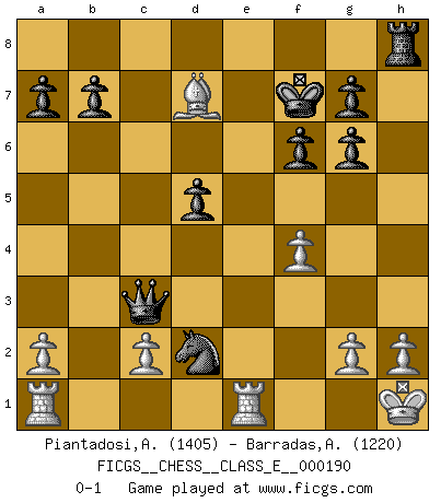 Last move : 0-1 2016 August 20 22:4:27 [Event "FICGS__CHESS__CLASS_E__000190"] [Site "FICGS"] [Date "2016.07.16"] [Round "1"] [White "Piantadosi,Angelo"] [Black "Barradas,Anderson"] [Result "0-1"] [WhiteElo "1405"] [BlackElo "1220"] 1.e4 e5 2.Nf3 Nc6 3.d4 exd4 4.Nxd4 Nxd4 5.Qxd4 d6 6.Bc4 Qf6 7.Be3 c5 8.Qd1 Qxb2 9.Nd2 Nf6 10.O-O Qe5 11.f4 Qc3 12.Bd3 c4 13.Nxc4 Nxe4 14.Qf3 d5 15.Ne5 Bc5 16.Bxc5 Qxc5+ 17.Kh1 Nd2 18.Qf2 Qc3 19.Bb5+ Ke7 20.Qh4+ f6 21.Ng6+ hxg6 22.Qxh8 Bd7 23.Rfe1+ Kf7 24.Bxd7 Rxh8 0-1 Scotch game Kingside Castling by player White (move 10) Player Black won this chess game. Follow this game move after move (download)The sign of a great Master is his ability to win a won game quickly and painlessly. (Irving Chernev) Der 70jährige Viktor Kortschnoi: Die Rentenanstalt wollte mich zwingen in Rente zu gehen. Meine Frau erhält jetzt eine Pension- und ich zahle weiter in die Rentenkasse ein! (Viktor Kortschnoi) No es suficiente ser un buen jugador, se debe también de jugar bién. (Siegbert Tarrasch) À la honte des hommes, on sait que les lois du jeu sont les seules qui soient partout justes, claires, inviolables et exécutées. Pourquoi l'Indien qui a donné les règles du jeu d'échecs est-il obéi de bon gré dans toute la terre, et que les décrétales des papes, par exemple, sont aujourd'hui un objet d'horreur et de mépris ? C'est que l'inventeur des échecs combina tout avec justesse pour la satisfaction des joueurs, et que les papes, dans leurs décrétales, n'eurent en vue que leur seul avantage. L'Indien voulut exercer également l'esprit des hommes et leur donner du plaisir; les papes ont voulu abrutir l'esprit des hommes. Voltaire (Dictionnaire philosophique / Garnier 1967) In theory there is no difference between theory and practice. In practice there is. (Yogi Berra)