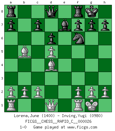 Last move : 1-0 2007 April 12 16:32:53 [Event "FICGS__CHESS__RAPID_C__000026"] [Site "FICGS"] [Date "2007.03.26"] [Round "1"] [White "Lorena,June"] [Black "Inving,Yugi"] [Result "1-0"] [WhiteElo "1400"] [BlackElo "0980"] 1.Nc3 Nf6 2.Nf3 Nc6 3.e4 e5 4.d4 d6 5.Be3 exd4 6.Nxd4 Nxd4 7.Bxd4 Be7 8.Bc4 O-O 9.O-O Be6 10.Nd5 Bxd5 11.exd5 b5 12.Bxb5 1-0 Dunst (Sleipner, Heinrichsen) Opening Kingside Castling by player Black (move 8) Kingside Castling by player White (move 9) Player White won this chess game. Follow this game move after move (download)By playing at Chess then, we may learn: First: Foresight... Second: Circumspection... Third: Caution... And lastly, we learn by Chess the habit of not being discouraged by present bad appearances in the state of our affairs, the habit of hoping for a favorable chance, and that of persevering in the secrets of resources. (Benjamin Franklin) Alle Schachspieler sollten auch ein Hobby haben. (Savielly Grigorievitsch Tartakower) No hay precio que sea tan grande por la cabellera del Rey enemigo. (Koblentz) Si je n'étais pas joueur d'échecs, je serais le meilleur dans quelque chose d'autre. (Anatoli Karpov) A journey of a thousand sites begins with a single click. (Author unknown)
