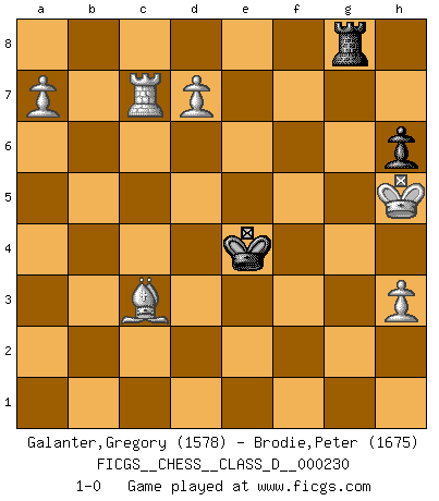 Last move : 1-0 2016 October 11 12:14:42 [Event "FICGS__CHESS__CLASS_D__000230"] [Site "FICGS"] [Date "2016.07.16"] [Round "1"] [White "Galanter,Gregory"] [Black "Brodie,Peter"] [Result "1-0"] [WhiteElo "1578"] [BlackElo "1675"] 1.e4 e5 2.Nf3 d6 3.g3 Nf6 4.d3 Bg4 5.h3 Bxf3 6.Qxf3 Be7 7.Bg2 O-O 8.O-O Nc6 9.c3 Re8 10.Nd2 Qd7 11.a4 a5 12.Nc4 d5 13.exd5 Nxd5 14.Qxd5 Qxd5 15.Bxd5 Bf6 16.Bxc6 bxc6 17.Re1 g5 18.Re4 h6 19.Bd2 Kg7 20.Rae1 Red8 21.R1e3 Rd5 22.Nxe5 Bxe5 23.Rxe5 Kf6 24.f4 gxf4 25.gxf4 Rxe5 26.Rxe5 Rb8 27.b4 axb4 28.cxb4 Rd8 29.Bc3 Kg6 30.d4 Ra8 31.a5 Ra7 32.Kf2 f6 33.Re6 Kf5 34.Rxc6 Kxf4 35.Rxf6+ Ke4 36.b5 Kd3 37.Rc6 Rb7 38.a6 Rxb5 39.a7 Rf5+ 40.Kg3 Rf8 41.Rxc7 Rg8+ 42.Kh4 Ke4 43.Kh5 Rh8 44.d5 Rd8 45.d6 Rg8 46.d7 1-0 Philidor's defense Kingside Castling by player Black (move 7) Kingside Castling by player White (move 8) 10 pieces endgame at move 38 : White KRBPPP , Black KRPP WHITE : King + 1 Rook 1 Bishop 3 Pawns BLACK : King + 1 Rook 2 Pawns 9 pieces endgame at move 41 : White KRBPPP , Black KRP WHITE : King + 1 Rook 1 Bishop 3 Pawns BLACK : King + 1 Rook 1 Pawn Player White won this chess game. Follow this game move after move (download)The game of chess is the touchstone of the intellect. (Goethe) Ich habe die besten Aussichten, den ersten Preis zu gewinnen - denn jeder muss gegen Steinitz spielen, nur ich nicht! (Wilhelm Steinitz) Haz el enroque temprano y seguido. (Rob Sillars) La guerre est enfant de la passion, la passion est enfant du narcissisme et le narcissisme est l'enfant. (...) Une autre partie ? (Thibault de Vassal) The next best thing to gambling and winning is gambling and loosing. (Nick Dandalos)
