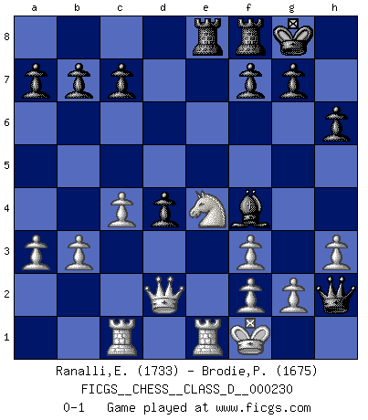 Last move : 0-1 2016 July 28 0:16:53 [Event "FICGS__CHESS__CLASS_D__000230"] [Site "FICGS"] [Date "2016.07.16"] [Round "1"] [White "Ranalli,Emmanuel Eduardo"] [Black "Brodie,Peter"] [Result "0-1"] [WhiteElo "1733"] [BlackElo "1675"] 1.d4 d5 2.Nf3 Bg4 3.h3 Bxf3 4.exf3 Nf6 5.Bd3 Nc6 6.O-O e6 7.c3 Bd6 8.Bg5 O-O 9.Nd2 h6 10.Bxf6 Qxf6 11.Re1 e5 12.dxe5 Nxe5 13.Bc2 Rae8 14.b3 Nc6 15.c4 Be5 16.Rc1 Nb4 17.a3 Nxc2 18.Qxc2 d4 19.Ne4 Qf4 20.Qd2 Qh2+ 21.Kf1 Bf4 0-1 Queen's pawn game Kingside Castling by player White (move 6) Kingside Castling by player Black (move 8) Player Black won this chess game. Follow this game move after move (download)In Fischer's hands, a slight theoretical advantage is as good a being a Queen ahead. (Isaac Kashdan) Modernes Schach sorgt sich zuviel um Dinge wie Bauernstruktur usw. Vergessen Sie das, Schachmatt beendet das Spiel! (Nigel Short) Los errores estan ahí, esperando a que se cometan. (Savielly Tartakower) Ce qui est bien, c'est d'avoir tout un tas de pièces en prise : l'adversaire ne peut en prendre qu'une à la fois. Cité par Thierry Audin. Creativity involves breaking out of established patterns in order to look at things in a different way. (Edward De Bono)