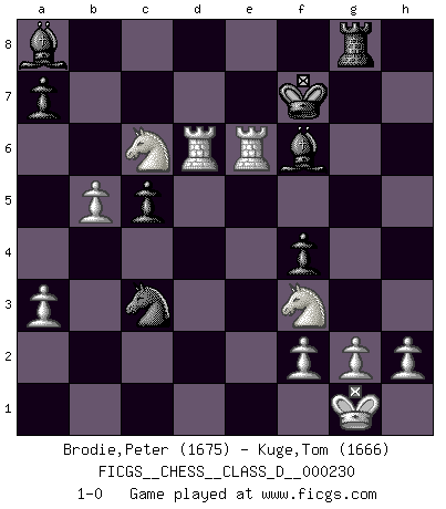 Last move : 1-0 2016 August 5 7:47:12 [Event "FICGS__CHESS__CLASS_D__000230"] [Site "FICGS"] [Date "2016.07.16"] [Round "1"] [White "Brodie,Peter"] [Black "Kuge,Tom"] [Result "1-0"] [WhiteElo "1675"] [BlackElo "1666"] 1.d4 Nf6 2.c4 c5 3.d5 Ne4 4.Qc2 Qa5+ 5.Nc3 f5 6.Nf3 g6 7.Bd2 Nxd2 8.Qxd2 Bg7 9.e3 O-O 10.Bd3 e5 11.O-O e4 12.Nxe4 Qxd2 13.Nexd2 Bxb2 14.Rab1 Bf6 15.e4 d6 16.exf5 gxf5 17.Rfe1 Na6 18.a3 Nc7 19.Nf1 b5 20.cxb5 Bb7 21.Ne3 f4 22.Nf5 Rfd8 23.Ne7+ Kf7 24.Nc6 Rg8 25.Bxh7 Nxd5 26.Bxg8+ Rxg8 27.Rbd1 Nc3 28.Rxd6 Ba8 29.R1e6 1-0 Vulture defense Kingside Castling by player Black (move 9) Kingside Castling by player White (move 11) Player White won this chess game. Follow this game move after move (download)Every Pawn is a potential Queen. (James Mason) Die westlichen Werte sind eine Sprache, welche die Putin-Administration nicht versteht. (Garry Kasparov) En el Ajedrez, tal como en la vida, las bendiciones de hoy pueden ser el veneno del mañana. (Assaic) 'L'échange des dames est un coup dur pour les deux adversaires...' Un journaliste lors d'une partie du match Spassky-Fischer I fear not the man who has practiced 10,000 kicks once, but I fear the man who has practiced one kick 10,000 times. (Bruce Lee)