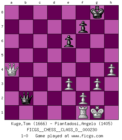 Last move : 1-0 2016 August 29 23:50:31 [Event "FICGS__CHESS__CLASS_D__000230"] [Site "FICGS"] [Date "2016.07.16"] [Round "1"] [White "Kuge,Tom"] [Black "Piantadosi,Angelo"] [Result "1-0"] [WhiteElo "1666"] [BlackElo "1405"] 1.c4 e6 2.Nc3 d5 3.e3 Nf6 4.b3 dxc4 5.bxc4 Be7 6.Be2 O-O 7.Nf3 c5 8.d3 Nc6 9.O-O b6 10.Bb2 Bb7 11.Ng5 h6 12.Nge4 Nxe4 13.Nxe4 Nb8 14.Bf3 Qc7 15.Qe2 Nd7 16.a4 Rfd8 17.Rfd1 Nf6 18.Nxf6+ Bxf6 19.Bxf6 gxf6 20.a5 bxa5 21.Rdb1 Bxf3 22.Qxf3 Rab8 23.Rxb8 Qxb8 24.Qxf6 Rxd3 25.g3 Qb7 26.Qxh6 Qb2 27.Qg5+ Kf8 28.Qxc5+ Kg8 29.Qxa5 Rd2 30.Rf1 Rc2 31.Qxa7 Rxc4 32.h4 Ra4 33.Qxa4 1-0 English Opening Kingside Castling by player Black (move 6) Kingside Castling by player White (move 9) Player White won this chess game. Follow this game move after move (download)Chess is thirty to forty percent psychology. You don't have this when you play a computer. I can't confuse it. (Judith Polgar) Spielt Blackmar-Diemer-Gambit, und das Matt kommt von selbst! (Emil Joseph Diemer) Yo considero que Fischer es uno de los expertos mas grandes de aperturas de siempre. (Keith Hayward) À la honte des hommes, on sait que les lois du jeu sont les seules qui soient partout justes, claires, inviolables et exécutées. Pourquoi l'Indien qui a donné les règles du jeu d'échecs est-il obéi de bon gré dans toute la terre, et que les décrétales des papes, par exemple, sont aujourd'hui un objet d'horreur et de mépris ? C'est que l'inventeur des échecs combina tout avec justesse pour la satisfaction des joueurs, et que les papes, dans leurs décrétales, n'eurent en vue que leur seul avantage. L'Indien voulut exercer également l'esprit des hommes et leur donner du plaisir; les papes ont voulu abrutir l'esprit des hommes. Voltaire (Dictionnaire philosophique / Garnier 1967) All the troubles of the world come from being unable to sit alone in a quiet room. (Blaise Pascal)