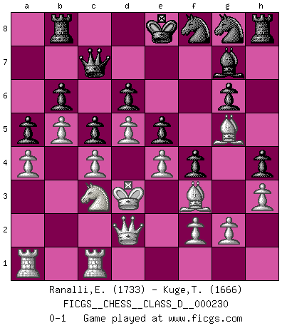 Last move : 0-1 2016 July 24 5:5:32 [Event "FICGS__CHESS__CLASS_D__000230"] [Site "FICGS"] [Date "2016.07.16"] [Round "1"] [White "Ranalli,Emmanuel Eduardo"] [Black "Kuge,Tom"] [Result "0-1"] [WhiteElo "1733"] [BlackElo "1666"] 1.Nf3 d6 2.c4 c6 3.d4 Qc7 4.Nc3 g6 5.e4 Bg7 6.Be3 Bg4 7.Be2 Nd7 8.O-O Ngf6 9.h3 Bxf3 10.Bxf3 e5 11.d5 c5 12.Qd2 h5 13.a3 a6 14.Rfc1 Rb8 15.b4 b6 16.b5 a5 17.a4 Ng8 18.Kf1 f5 19.Bg5 f4 20.Ke2 h4 21.Kd3 Nf8 0-1 Reti Opening Kingside Castling by player White (move 8) Player Black won this chess game. Follow this game move after move (download)No one ever won a game by resigning. (Unknown) Die FIDE ist dabei in die Hände der russischen Mafia zu fallen. (Larry Evans) Te sientas frente a un tablero y repentinamente tu corazón brinca. Tu mano tiembla al tomar una pieza y moverla. Pero lo que el Ajedrez te enseña es que tu debes permanecer ahí con calma y pensar de que si realmente es una buena idea o de que si hay otras ideas mejores. (Stanley Kubrick) Les Echecs ne sont pas pour les âmes timides. Ils requièrent un homme entier, qui ne s'arrête pas aveuglément à ce qui a été déjà établi, mais qui tente individuellement de sonder les profondeurs du jeu. (W. Steinitz) At work, the authority of a person is inversely proportional to the number of pens that person is carrying. (Dan Rotaru)